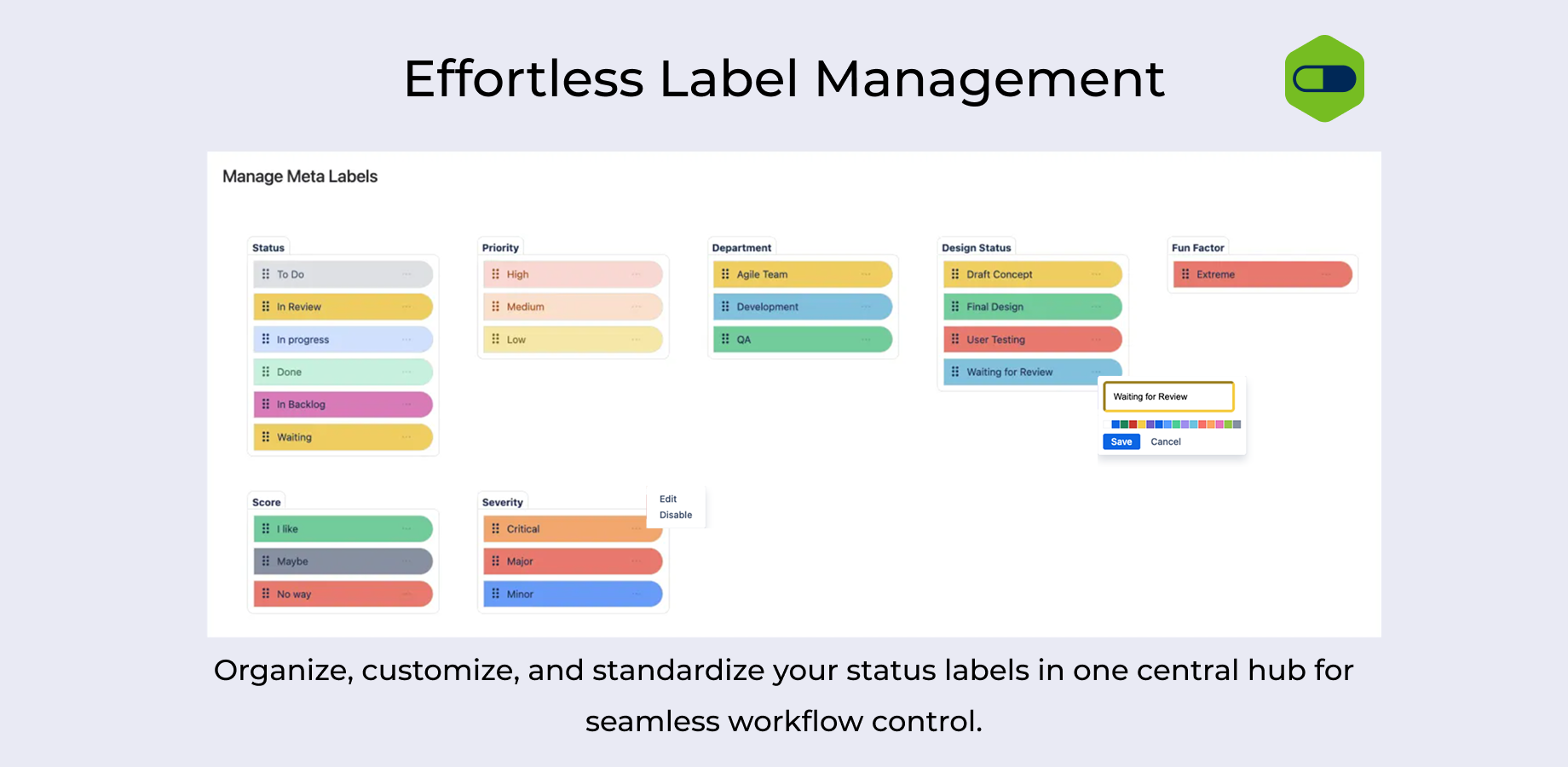 - Create custom pill-style labels with categories like Status, Priority, or Department and custom values