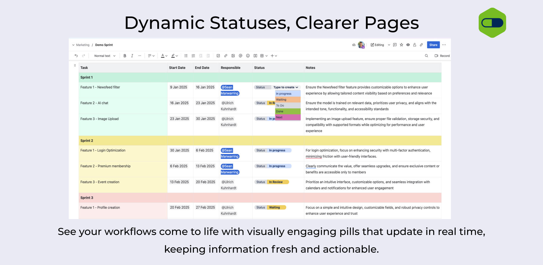 Track progress, manage workflows, and bring clarity to your Confluence pages with fully customizable, pill-shaped status labels