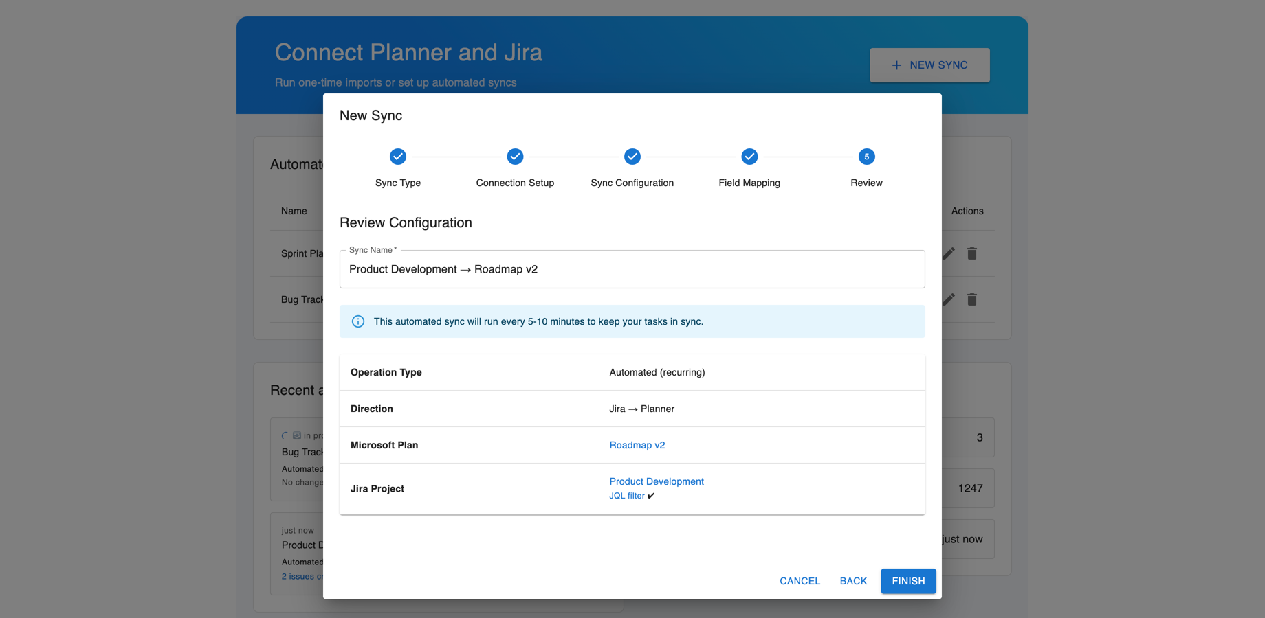 - Easy Setup: A guided wizard helps connect Planner and Jira, select plans/projects, map fields, and review sync details