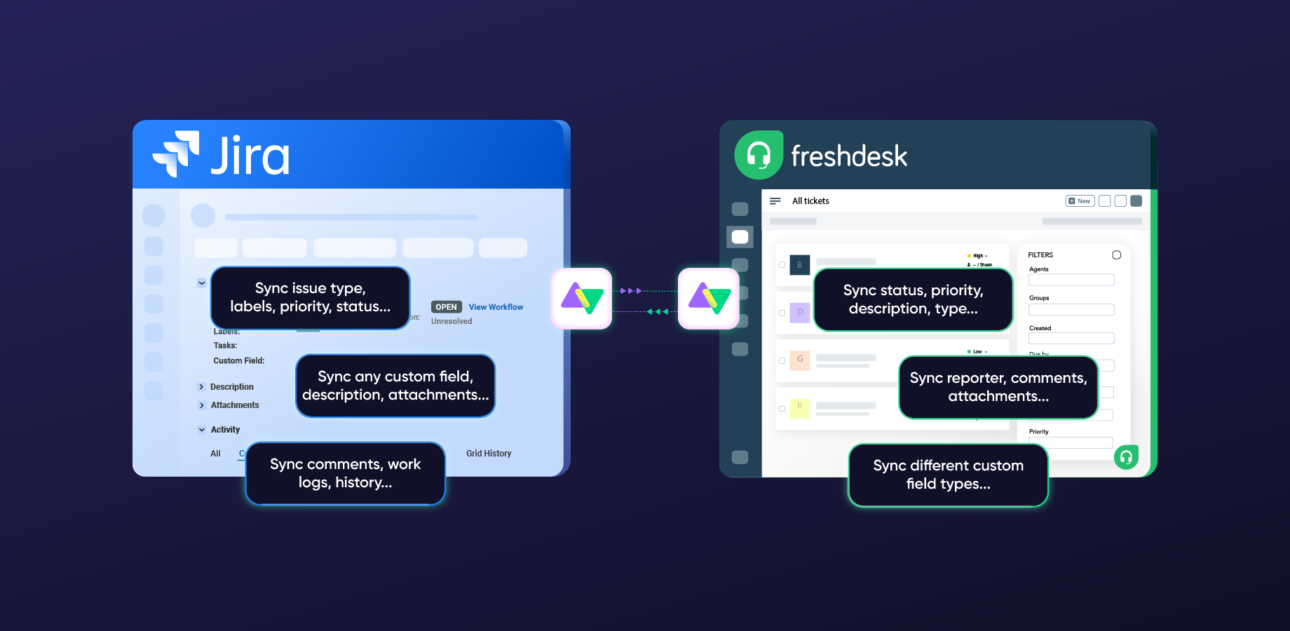 Sync Freshdesk tickets bidirectionally with Jira issues. Monitor issues in real time. Create your custom sync rules easily with an AI-assisted script console.