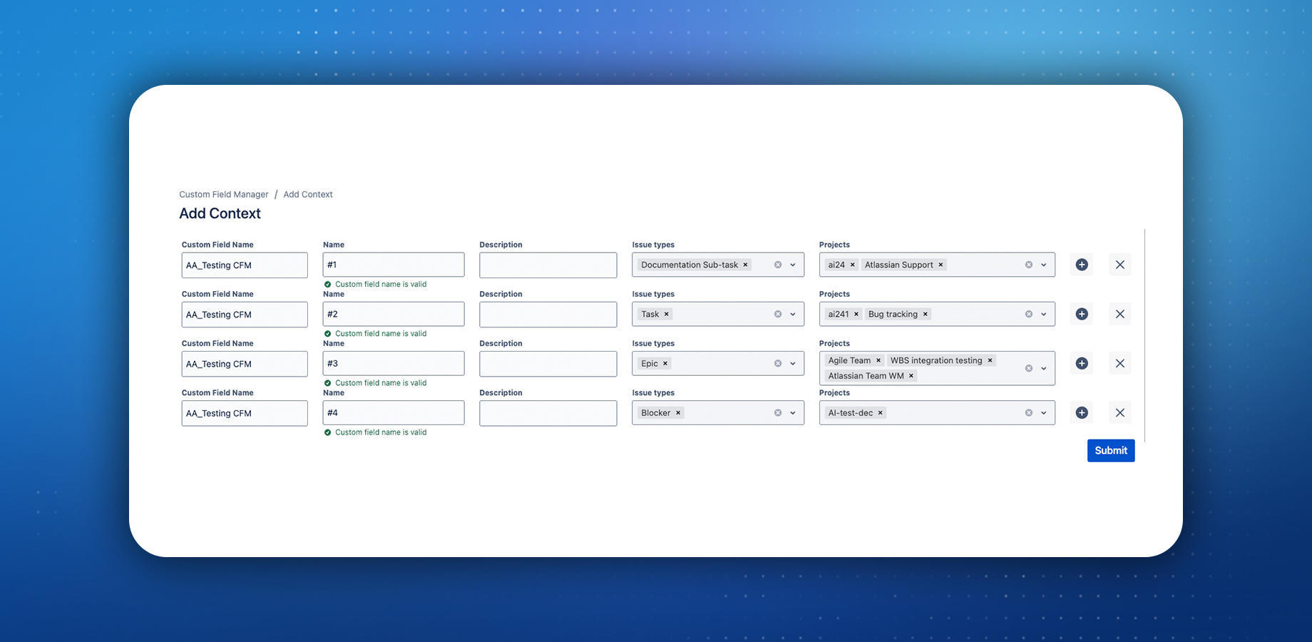 You can quickly and easily add multiple custom fields, contexts, and options at once using a single, intuitive form. It significantly saves you time, ensuring that you can manage and scale CFs effortlessly.
