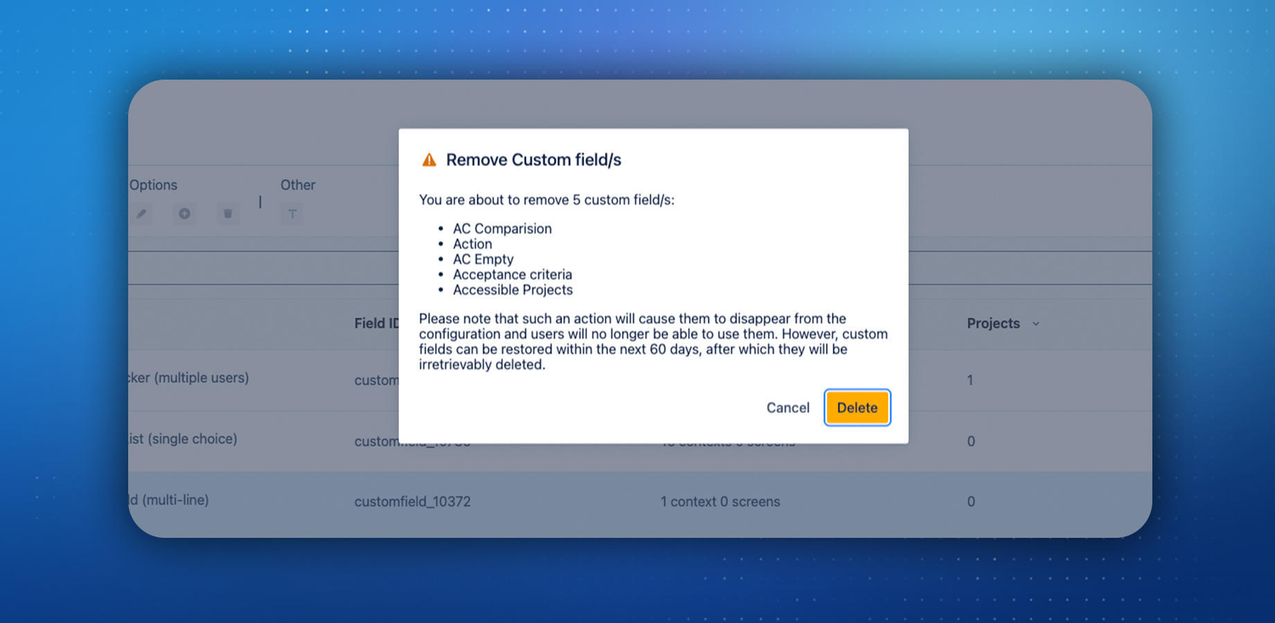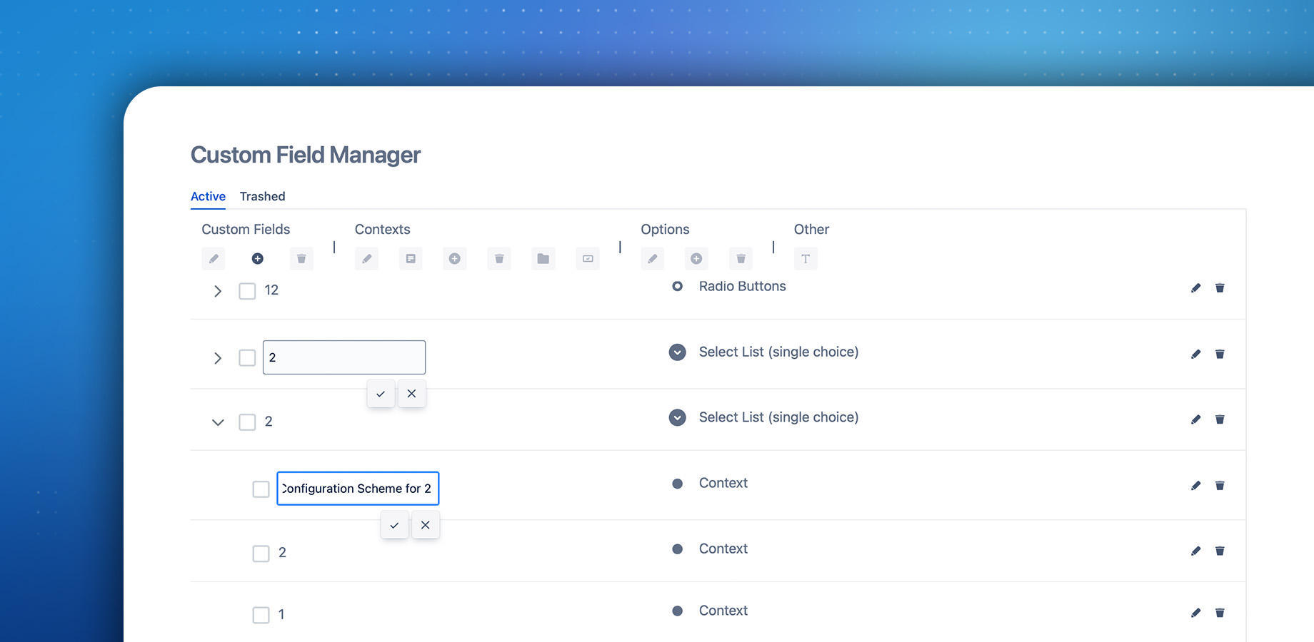 Use the unique capability of deleting multiple custom fields, contexts, or options in a single action. By simply selecting what you want to remove, you can perform bulk deletions seamlessly.