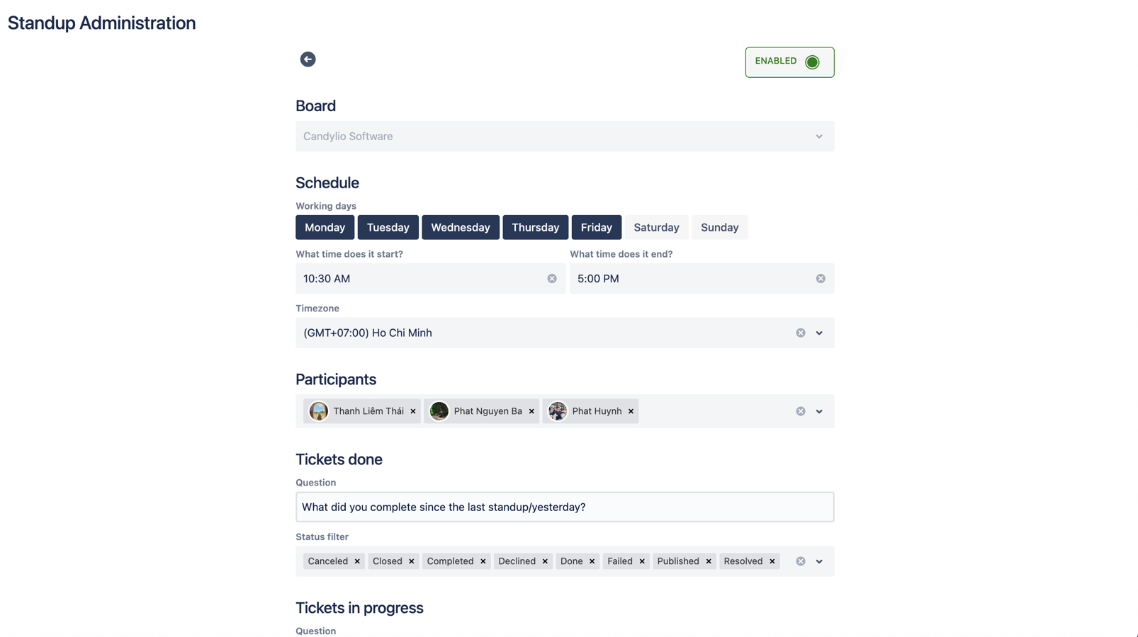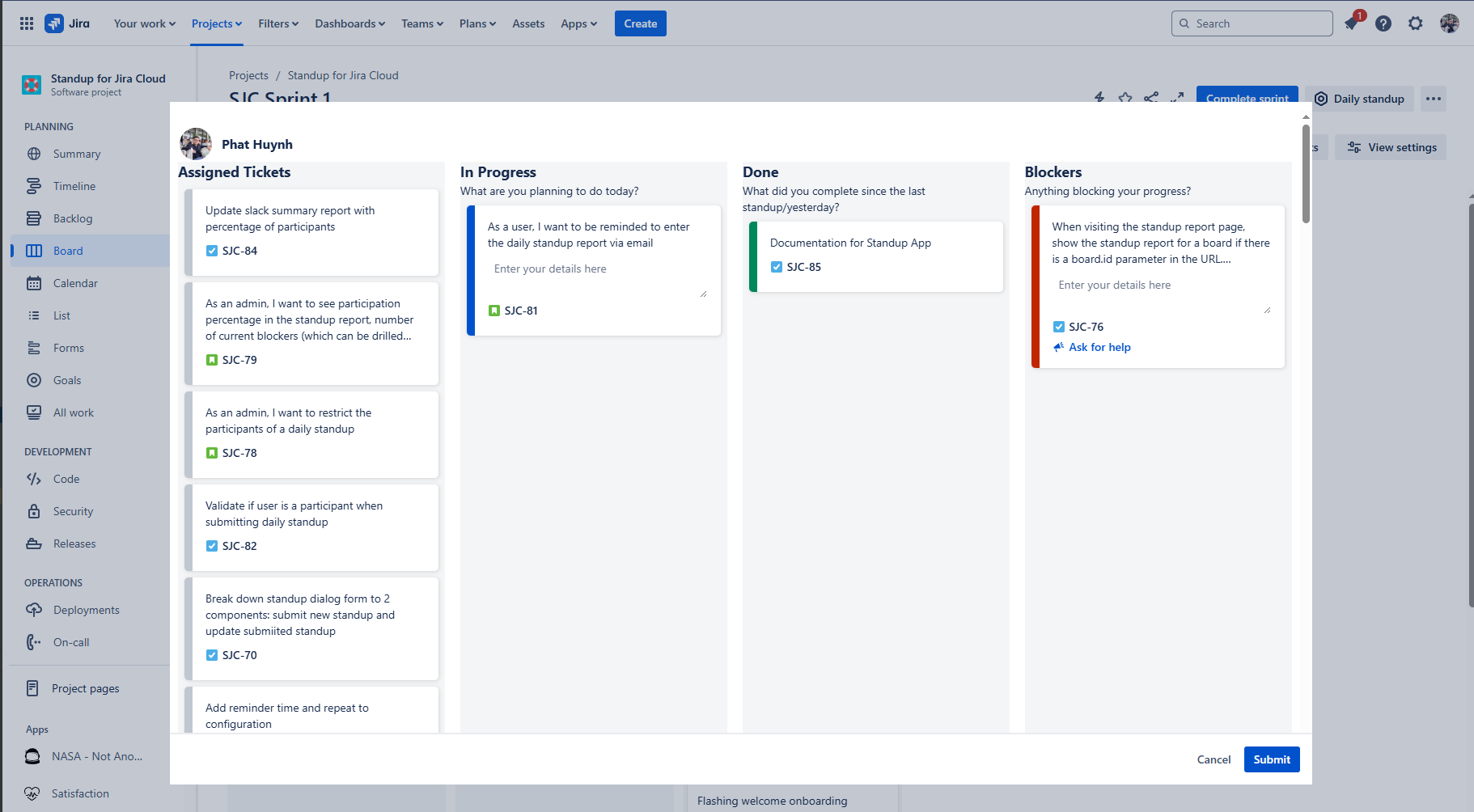 Please read the app’s installation and user guide to get started. Submitting a standup update on a Jira agile board is now easier than ever. Admin can also have a fine-grained control on when and how the the team exercise the rituals. Slack integration is also supported (MS Team integration is coming soon). Everyone can stay up-to-date with notifications and reports.