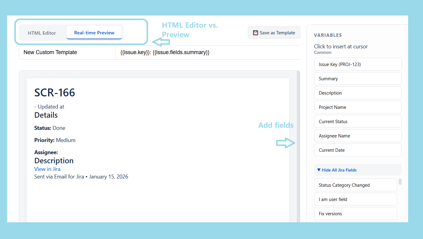 • πŸ”— Variable Replacement – Auto-populate issue fields (summary, status, assignee, etc.)