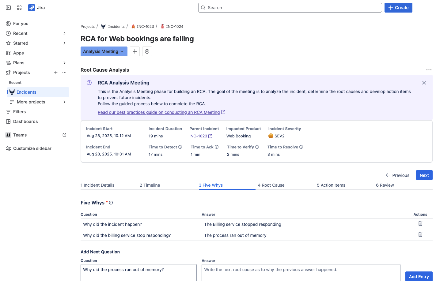 Backed by industry best practices, and assisted by AI, we guide your product engineering team through the RCA process from data gathering, through the Five Whys and action items to prevent future incidents.