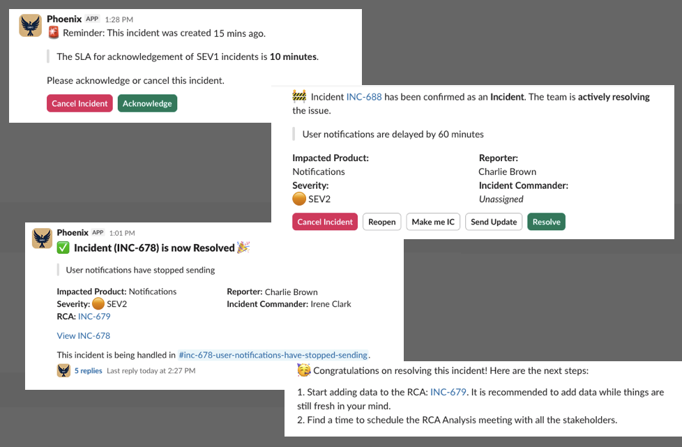 Phoenix Incidents keeps every part of your incident lifecycle inside Jira—from detection to resolution to root cause. Assign an Incident Commander, coordinate in Slack or Microsoft Teams*, and keep execs, customer success, and engineering aligned through automated updates and reminders.