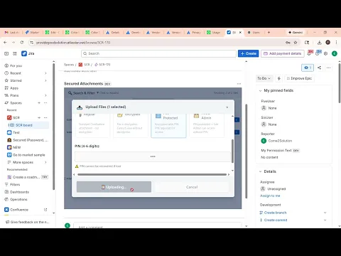 π Secured Attachments empowers Jira users with enhanced file security. Upload files directly to issues with four protection levels: π Regular (standard), π Encrypted (admin-only), π’ PIN Protected (4-6 digit PIN required), and π PIN & Admin (PIN + admin bypass).