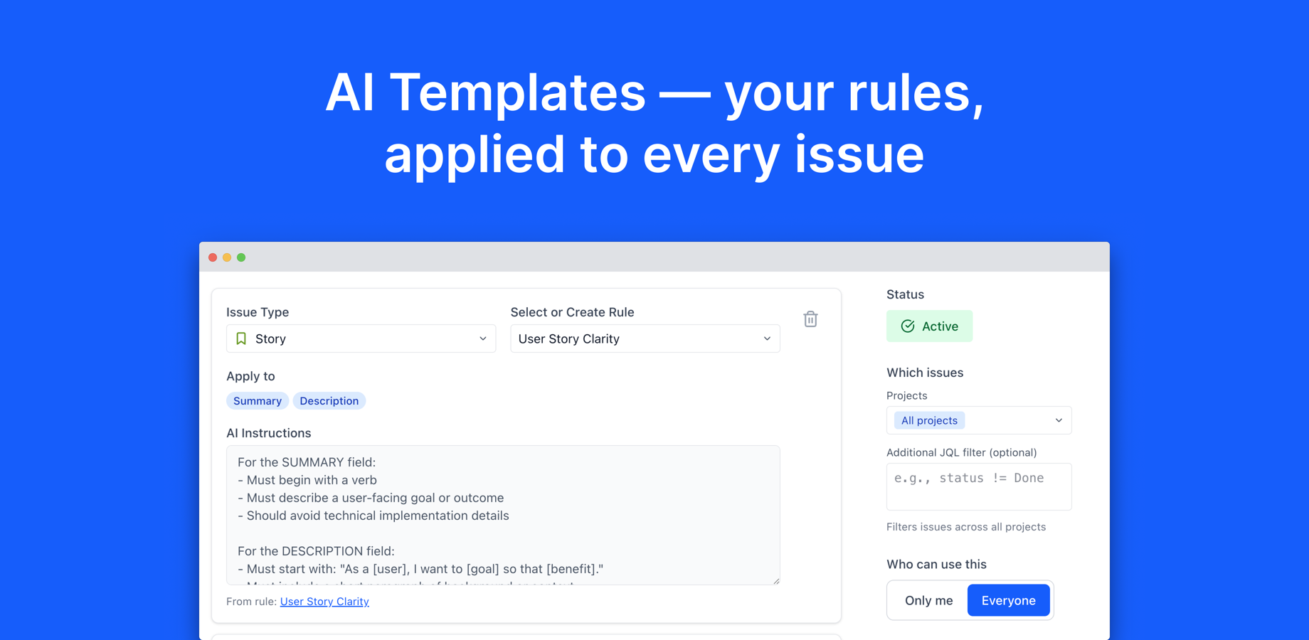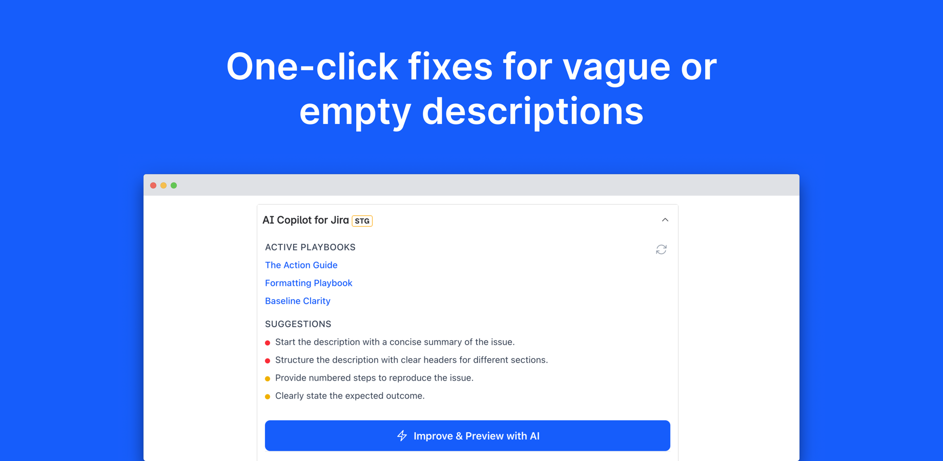 AI Copilot reviews each issue for missing or unclear content — like vague summaries or empty descriptions. The widget shows what needs attention and offers one-click AI improvements, right inside Jira.