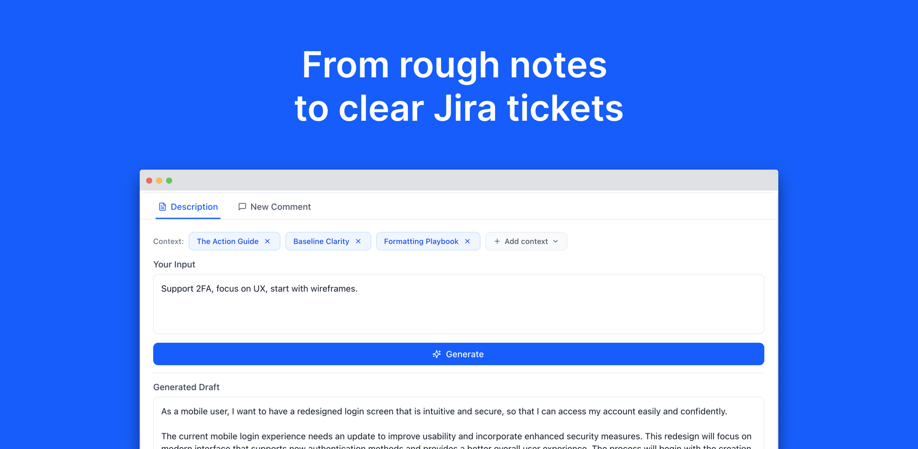 - Write from scratch — Turn rough ideas into clear, structured Jira descriptions