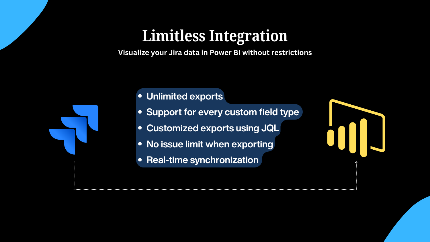 Connect Jira and Power BI for comprehensive data analysis without technical barriers. Transform your Jira issues into powerful visualizations that drive smarter business decisions across your organization. We offer both JQL issue filtering and a no-code solution, allowing you to precisely select the data you need with ease.