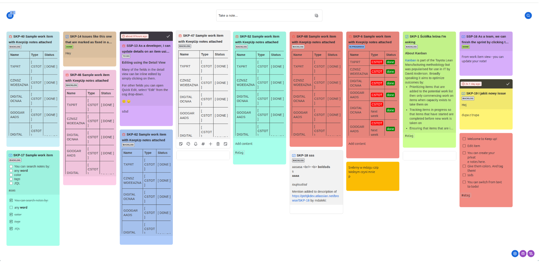 Use colors and tags to sort your notes your way. Drag, drop, and search across notes by text, JQL, color, or tag.