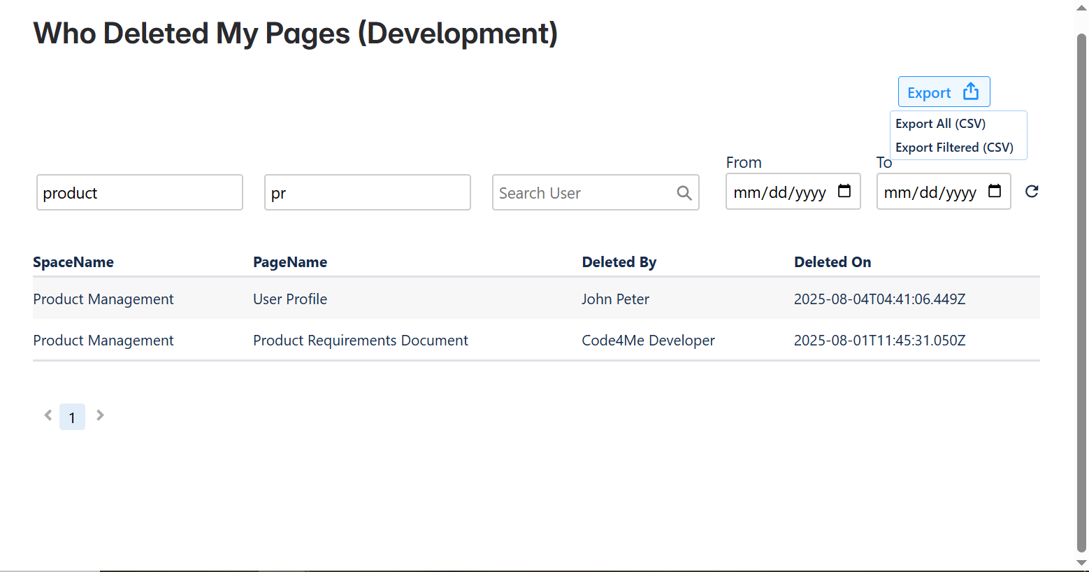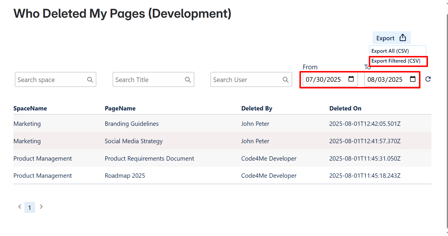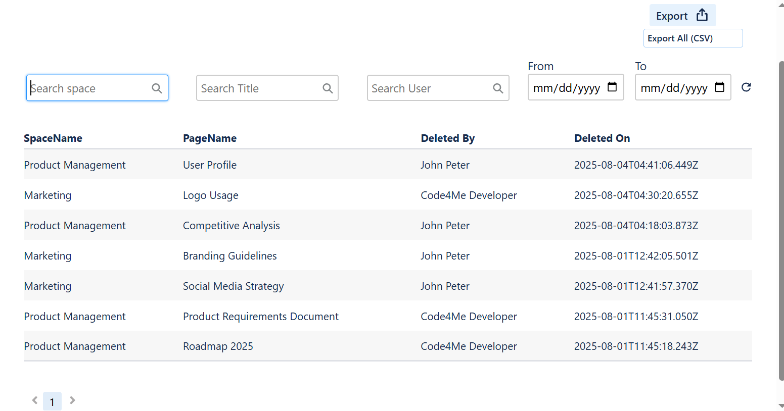 Easily filter deleted Confluence pages by user, page title, or deletion date. Find specific entries quickly and keep your audit trail clear, organized, and actionable.