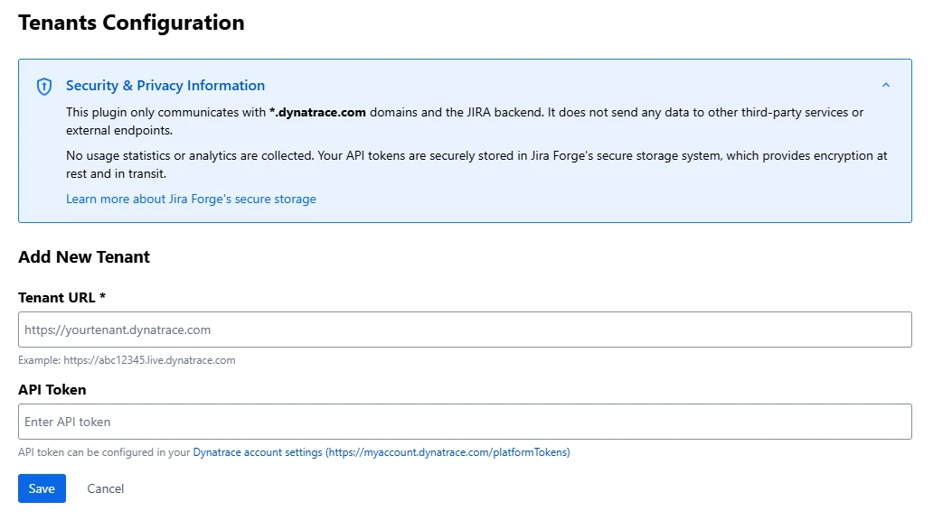 Set up in minutes with a tenant URL and API token. Quickly connect Jira to Dynatrace, test the link, and manage tenants securely with Forge’s encrypted storage.