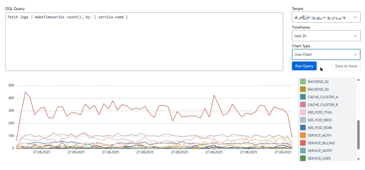 - DQL Query Editor with real-time syntax validation and autocomplete - write Dynatrace Query Language queries without leaving Jira.