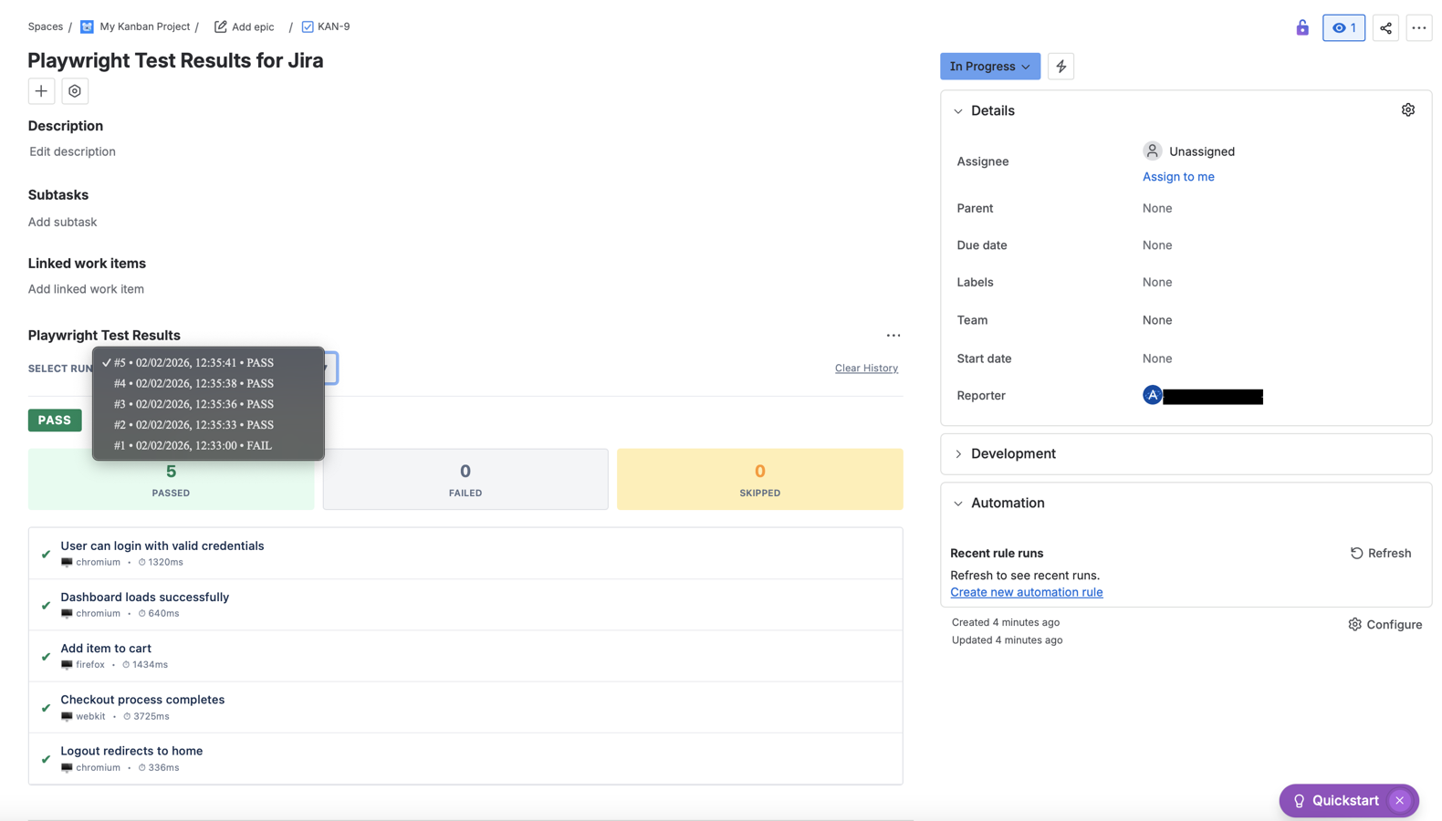 Instantly see Playwright test results, execution duration, and browser engines (Chromium, Firefox, WebKit) directly inside your Jira issues.