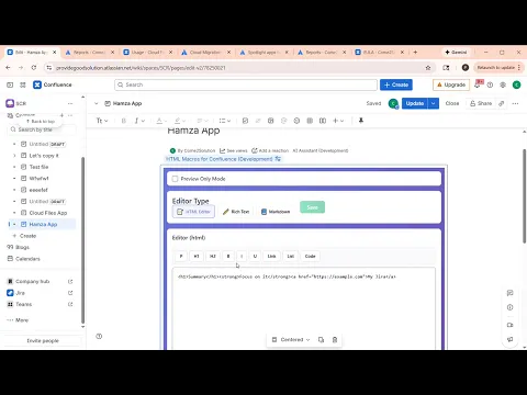 🎯 Core Functionality: A versatile 3-in-1 content editor for Confluence with HTML, Rich Text, and Markdown editing modes. Features live preview, auto-save, and clean view mode toggle.
