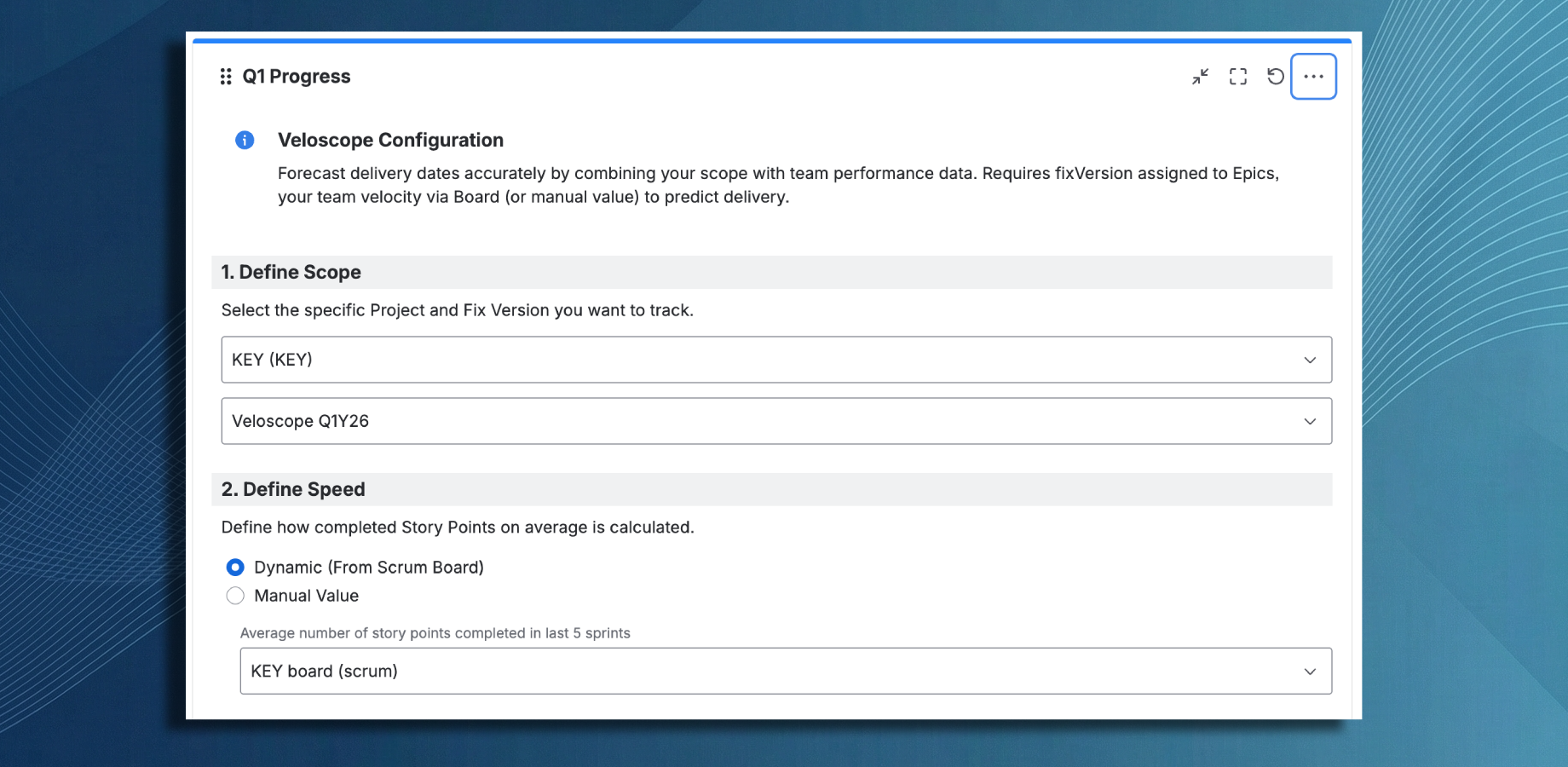 Choose a project and fix version, connect a Scrum board for real velocity, or enter a manual value. No complex configuration, no JQL, and no spreadsheets — just actionable forecasts.