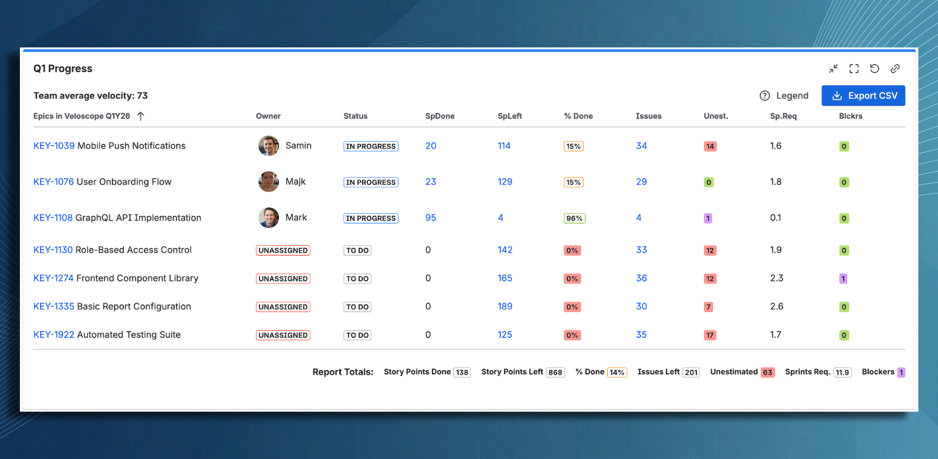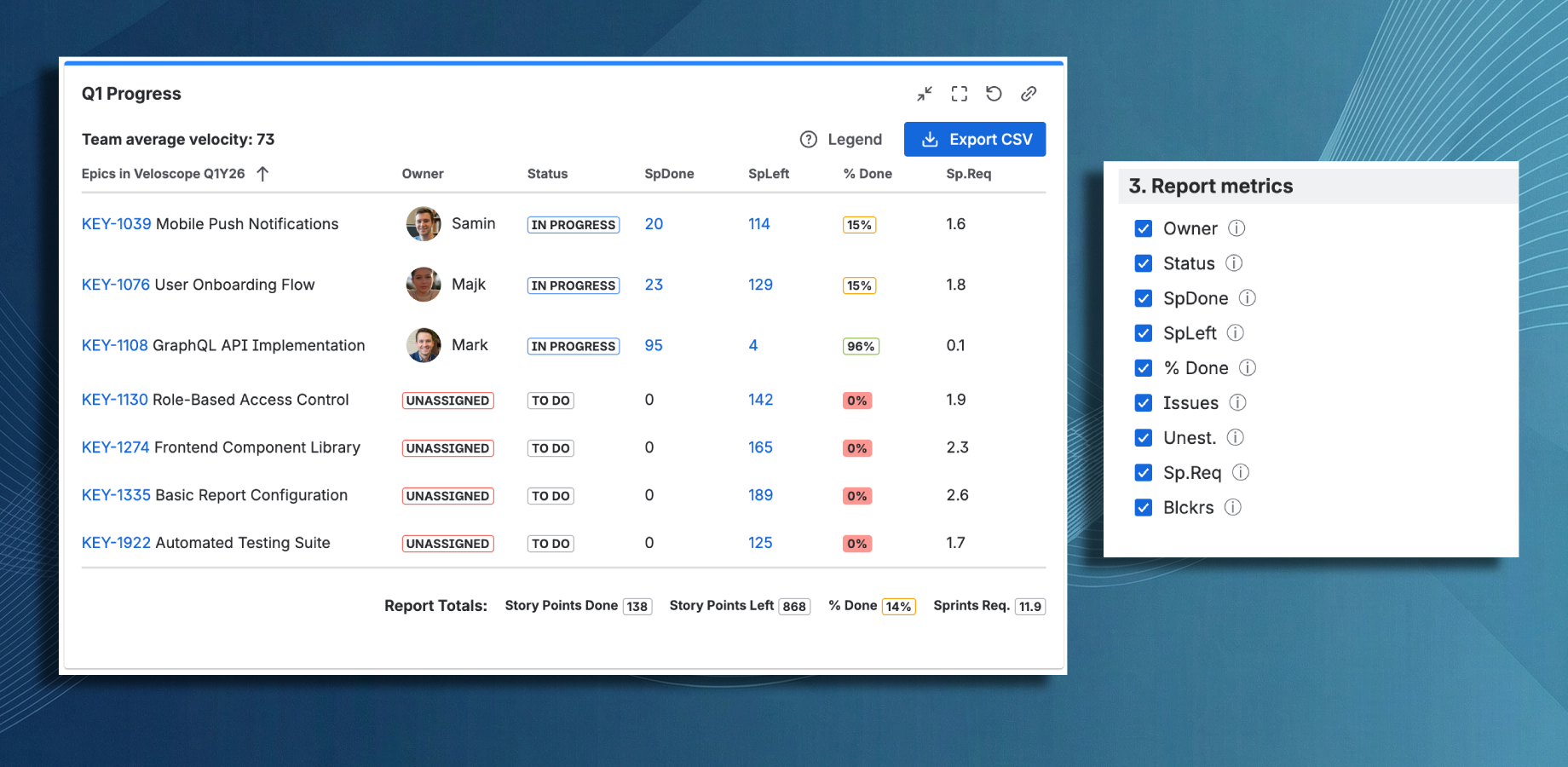 Select exactly which metrics appear in your report. Show progress, unestimated work, blockers, and sprint forecasts to tailor dashboards for engineering teams or stakeholders.