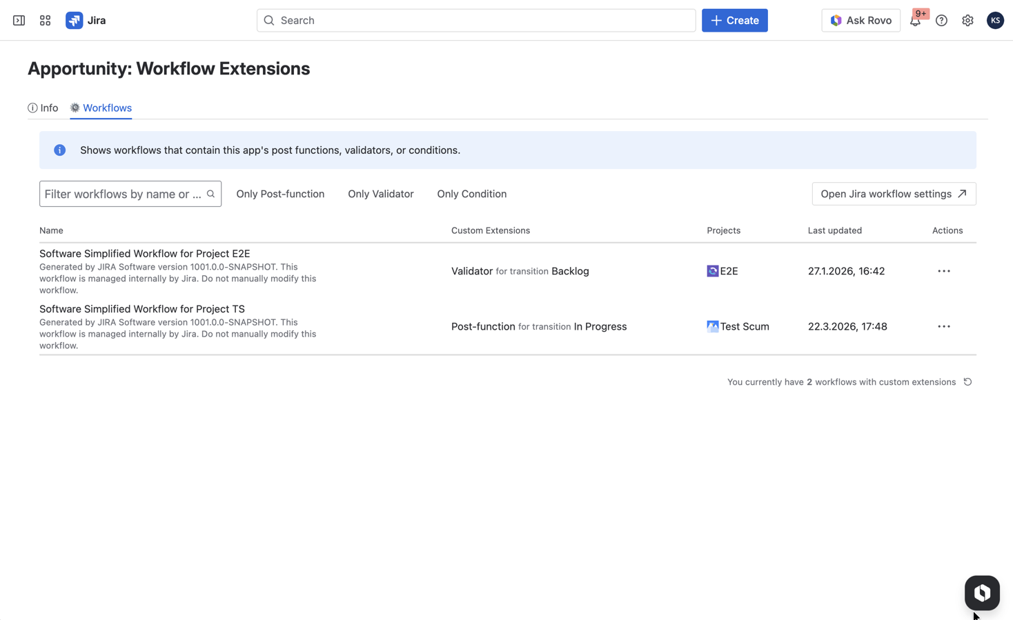 Apportunity: Workflow Extensions extends Jira Cloud workflows with powerful, flexible automation using Jira Expressions. Add dynamic conditions to control transition visibility, validators to enforce rules before execution, and post functions to automate actions like adding comments.