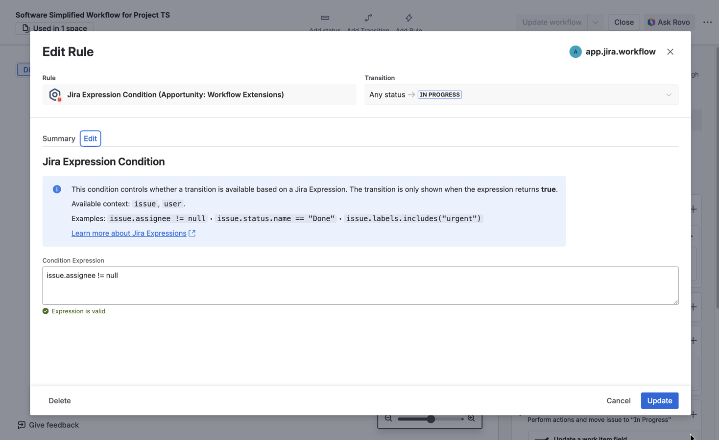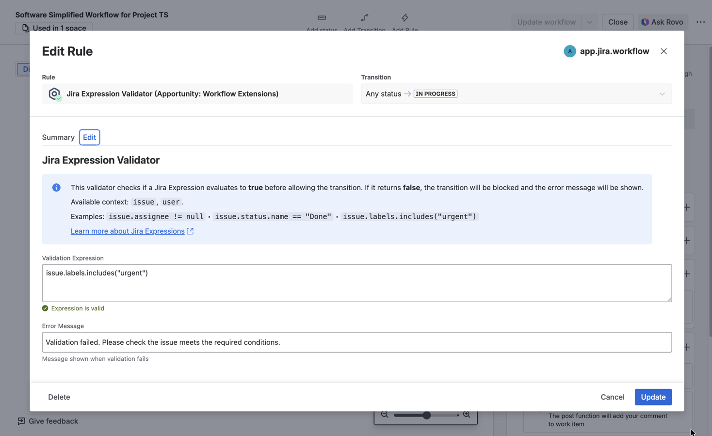 • Add Jira Expression Validator to enforce workflow rules