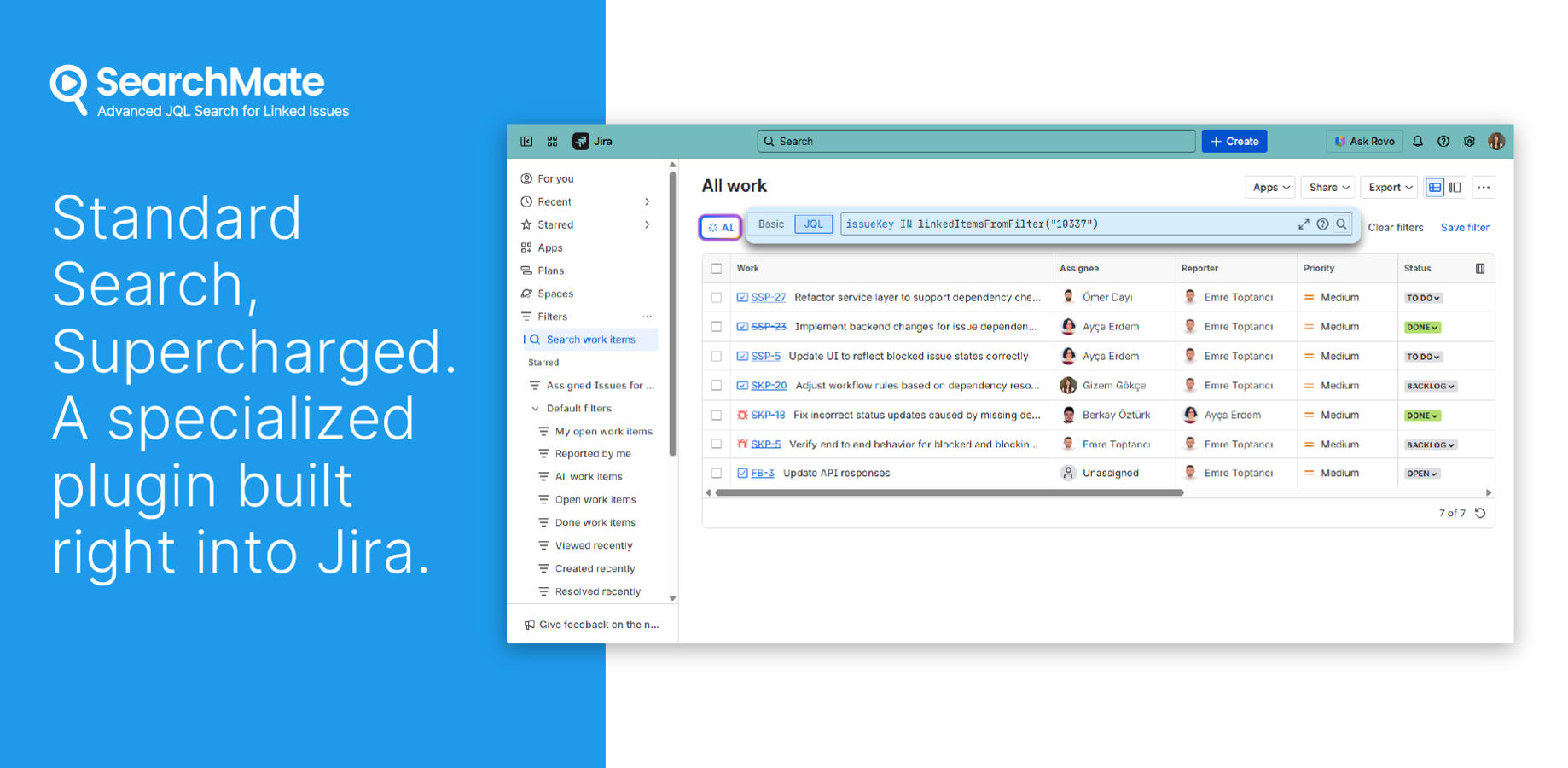 Native Jira search is powerful for finding issues, but it struggles to track relationships. SearchMate transforms JQL into a high-performance engine for linked issues, eliminating manual searches so you can master dependency tracing across projects. The app integrates directly into your standard Jira Issue Search screen for immediate use.