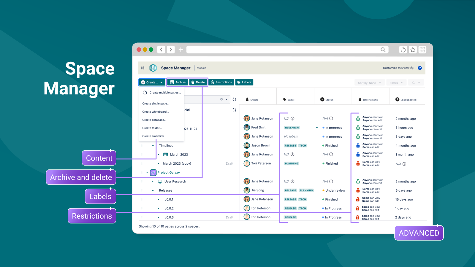 Manage Confluence spaces effortlessly from one hub.