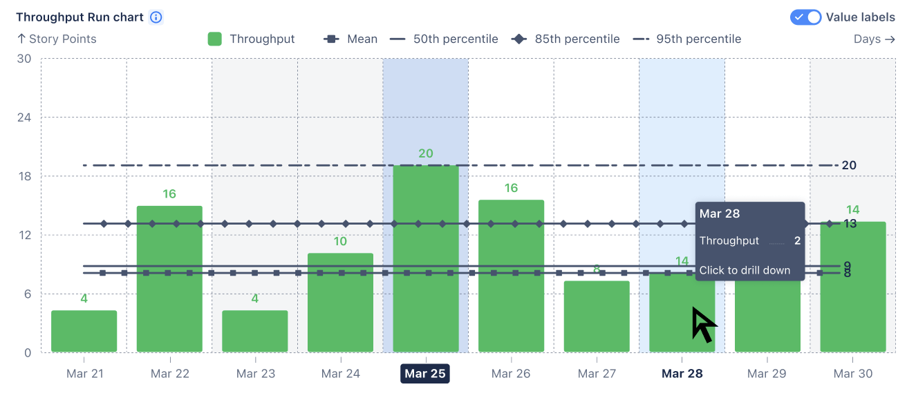 - Configure reliable sampling & grouping: set date ranges and group by day/week/sprint