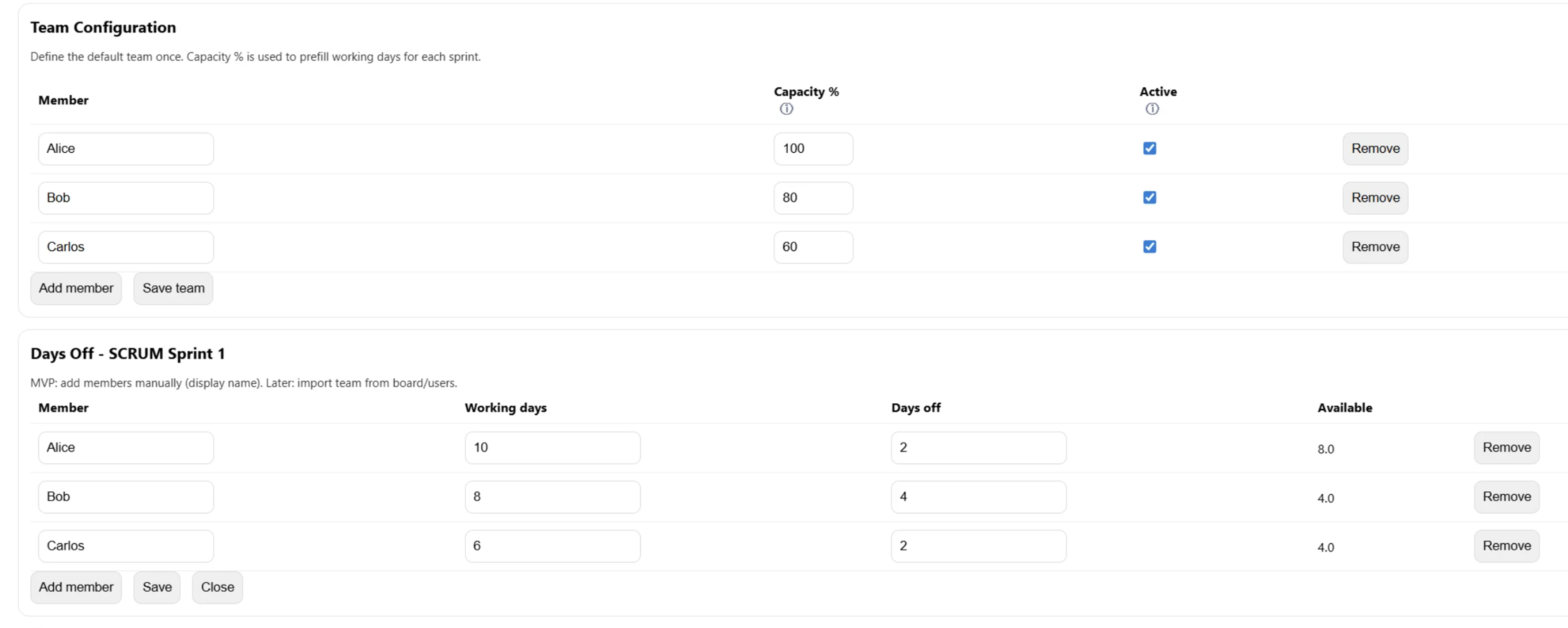 Calculate true sprint capacity based on team availability, days off, and part-time members.