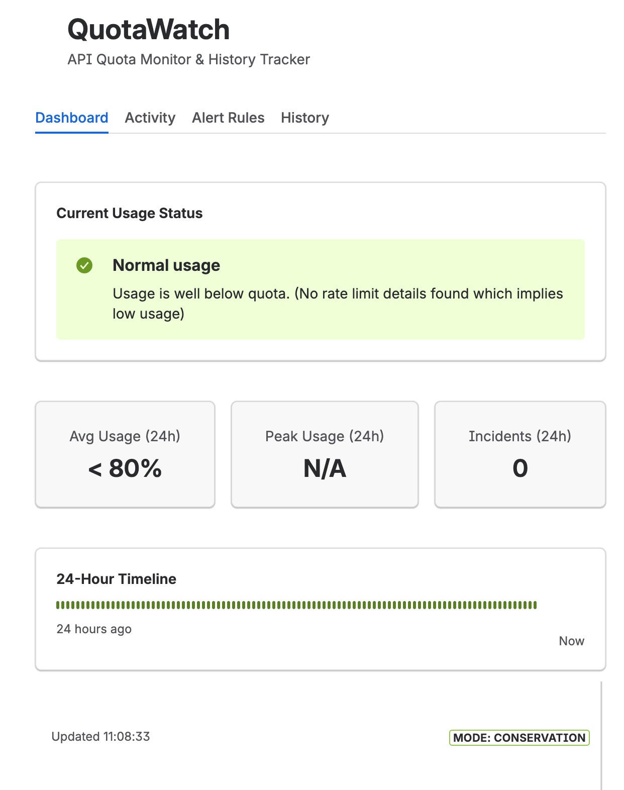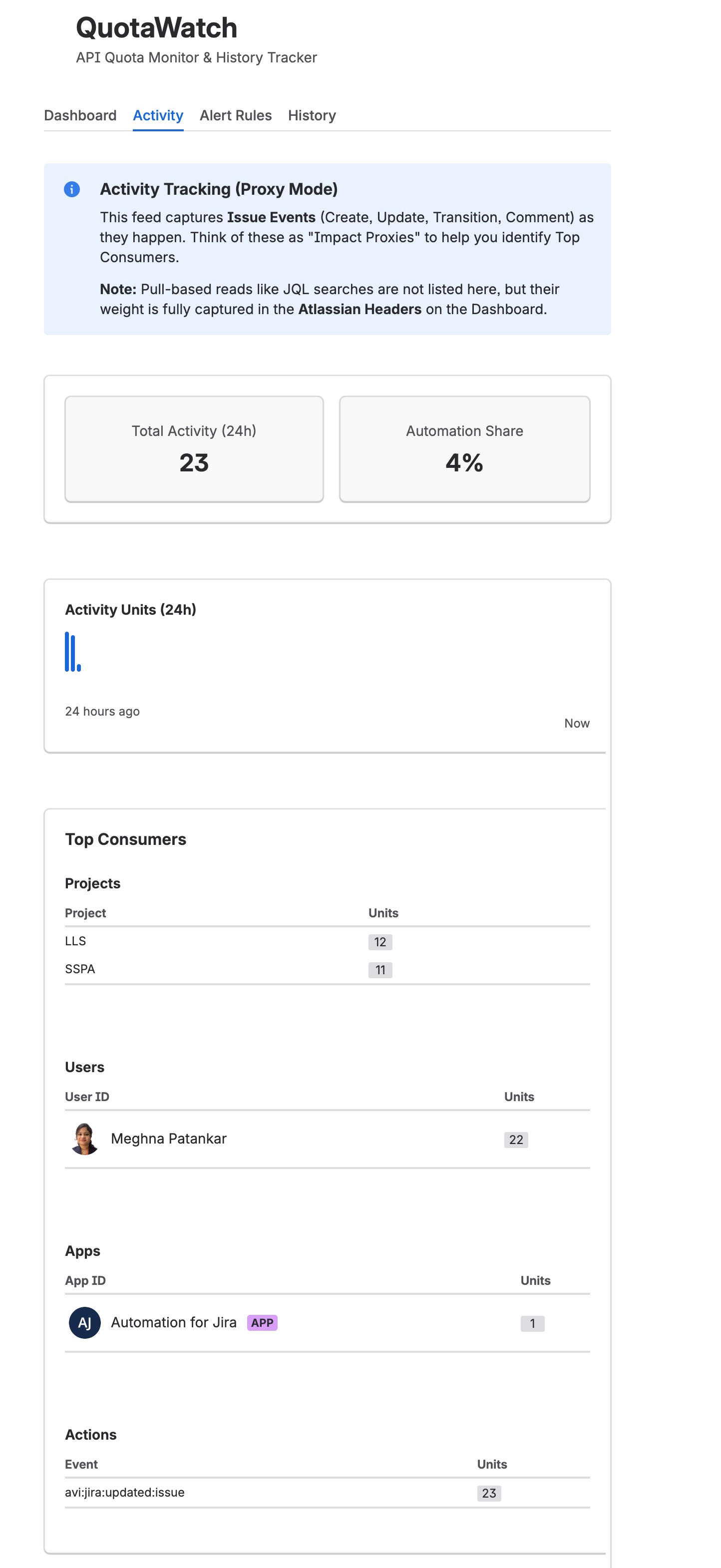 - Real-Time Monitoring: View remaining API quota, active Atlassian policies, and 24-hour visual consumption timelines.