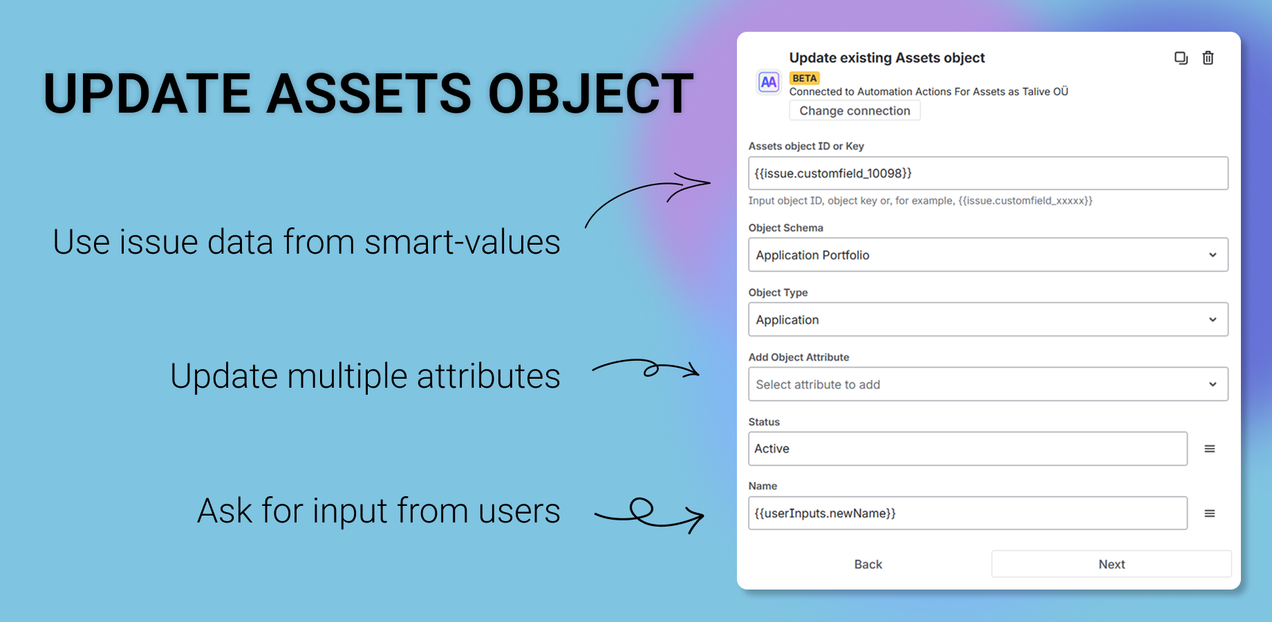 Update any Assets object using issue smart-values or user input. Target by ID, key, or custom field and modify multiple attributes in one step.