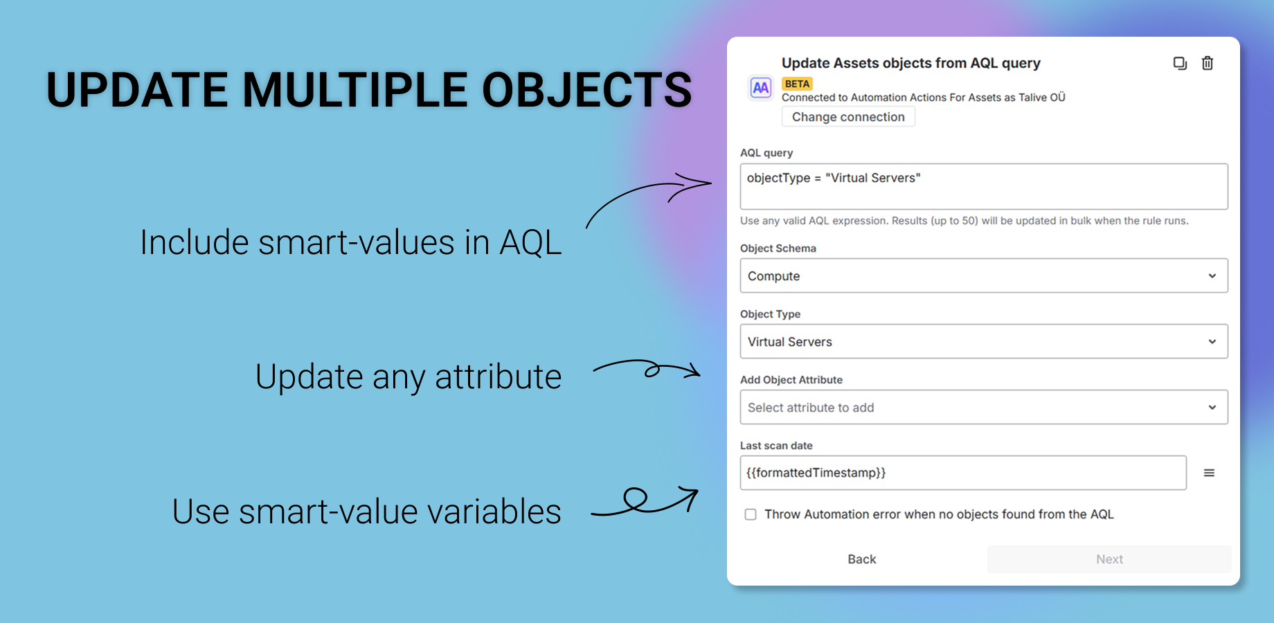 Run an AQL query to update up to 50 objects at once. Use smart-values in the query and in attributes, add variables (e.g., timestamps), and choose to error if nothing matches.