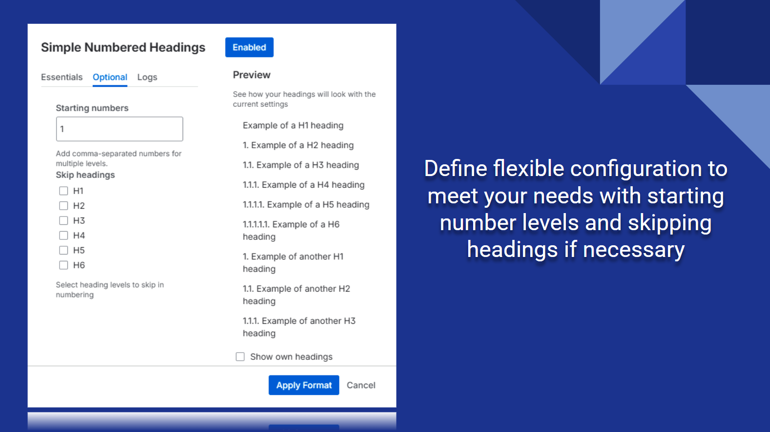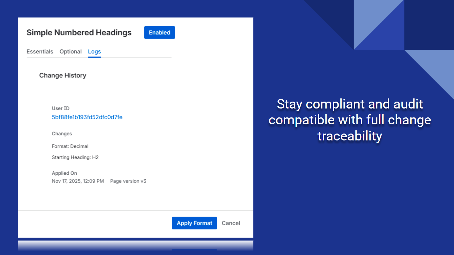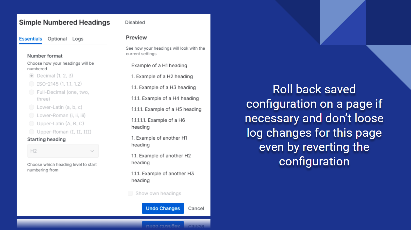 Manage your pages and documents within Confluence with automatic numbered headings functionalty and vast configuration options to individualize the heading types and standards for each page. Stay on track with all changes with the included logging feature to make sure you stay safe with full content change tracebility.