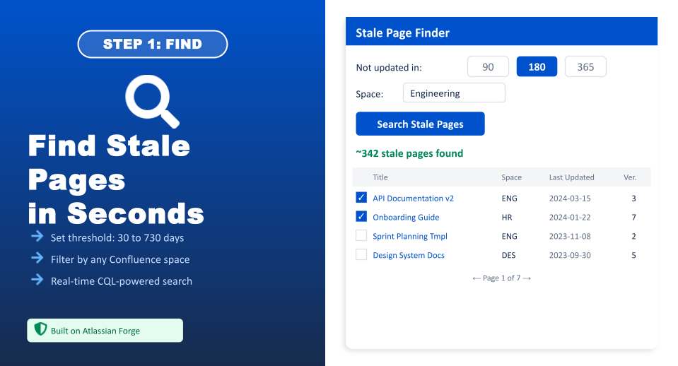 Scan your Confluence instance for stale and unused pages. Set flexible age thresholds — 90 days, 180 days, a year, or custom — and filter by space. Results appear in seconds with sortable columns.