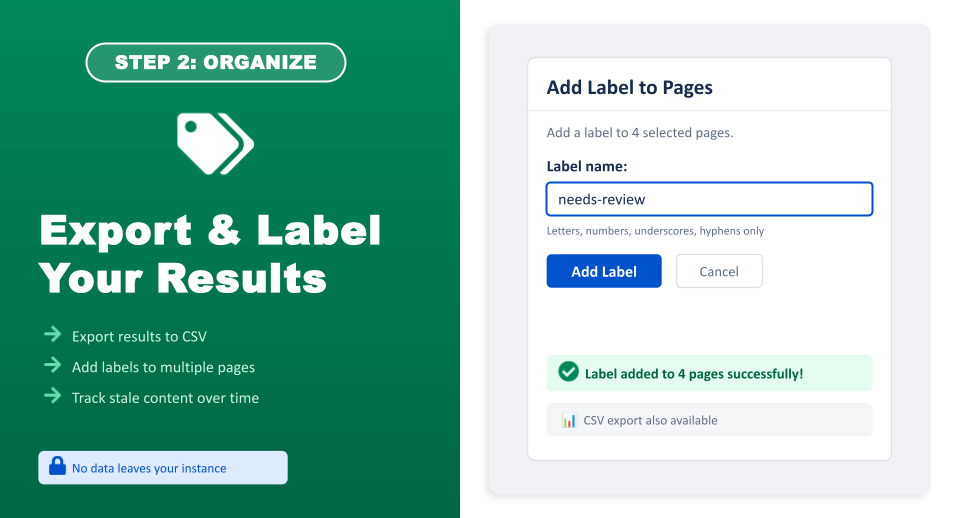 Download search results as CSV for offline review, or add labels like "needs-review" to multiple pages at once. Keep your cleanup organized and trackable.