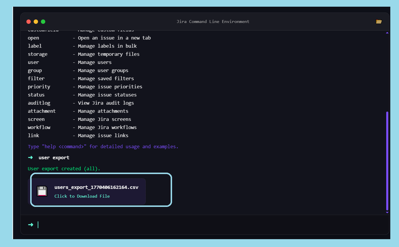 Export any Jira data—issues, projects, users, sprints—to CSV with one command. 📊 Download instantly or store for later. Perfect for reports & backups! ⚡