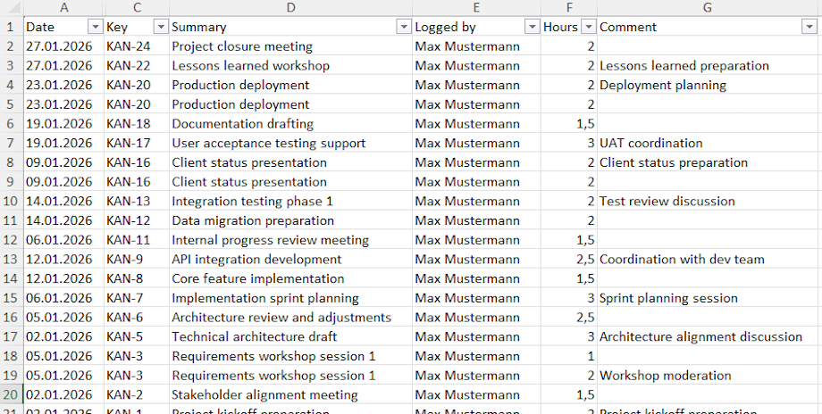 - Timesheet – Structured worklog visibility across Jira spaces.