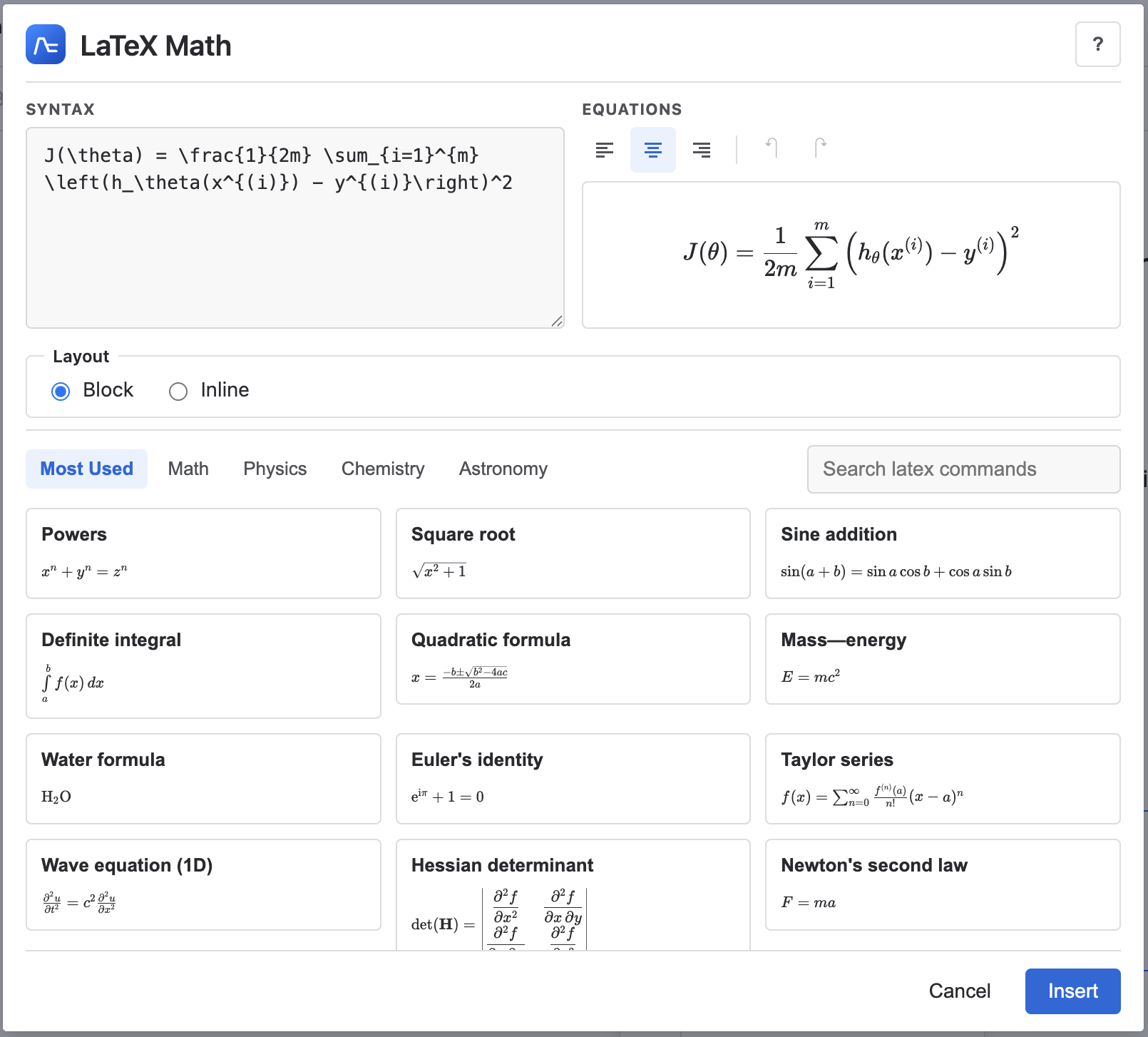 - Display LaTeX equations inline or within fully resizable blocks