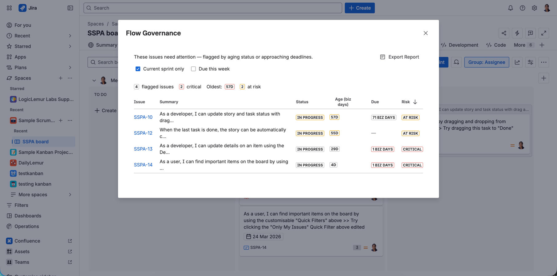 - Standup Modal: Sort your board by risk, filter "Due This Week", and spot bottlenecks instantly.