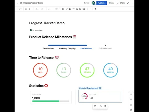 This app contains a number of Confluence macros that allow page editors to show progress towards a goal or count down the time remaining before a given date and time.