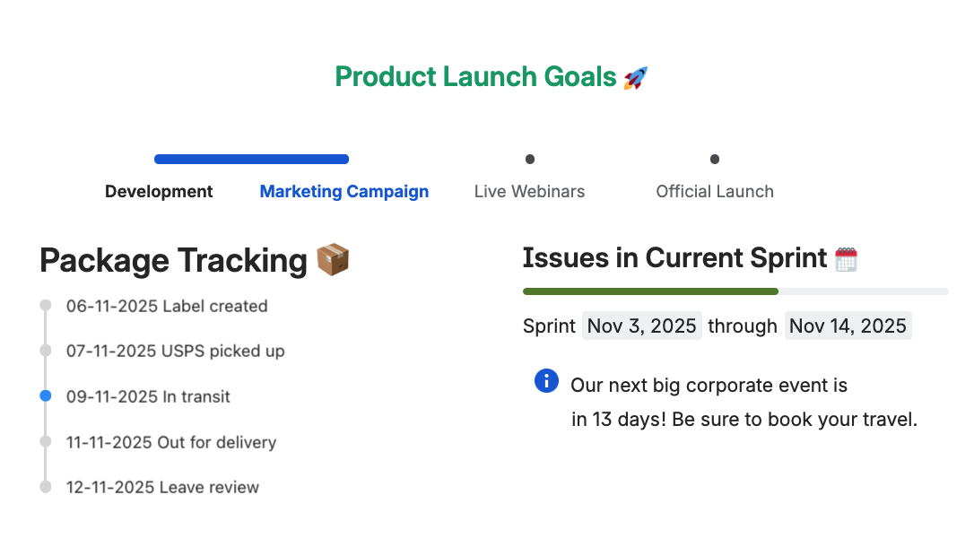 - Progress Tracker - allows the page editor to define any number of steps, as well as which step is the current one. This allows viewers of the page to easily see where a process is in its flow.