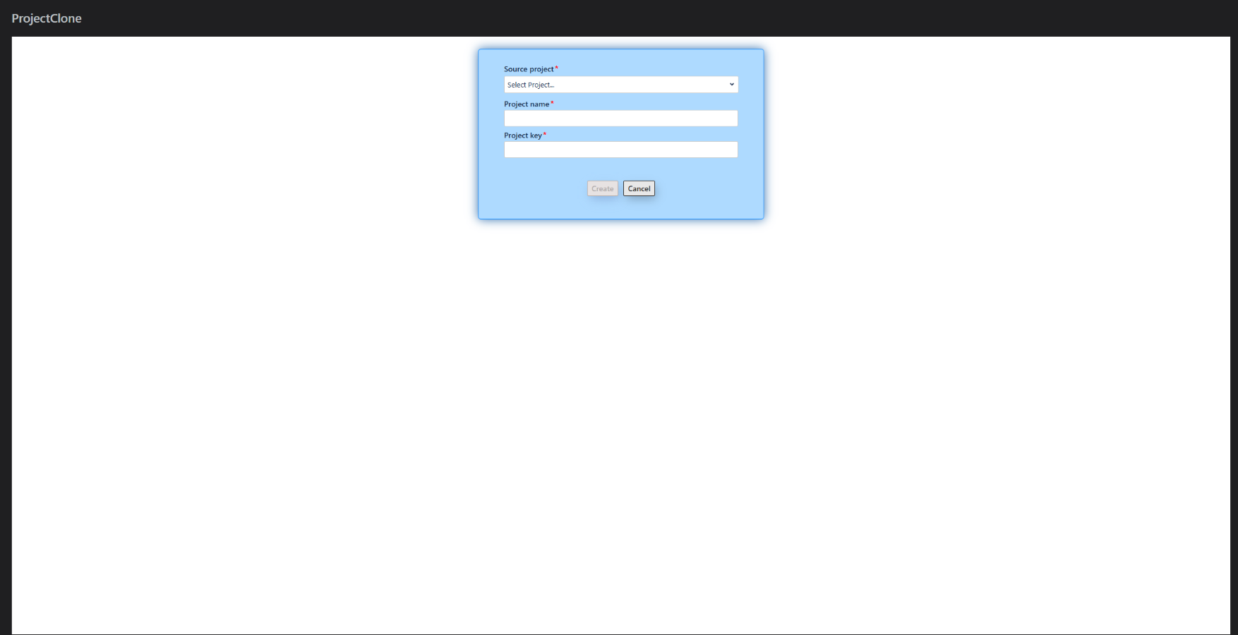 ProjectClone Configuration Interface displays the project cloning setup form with essential fields including source project selection, project naming, and advanced scheme options.