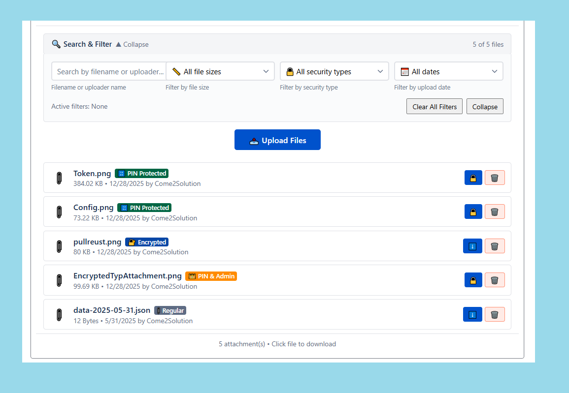 π Encrypted File Management β Upload files with 4 security levels: Regular, Encrypted, PIN Protected, PIN & Admin.