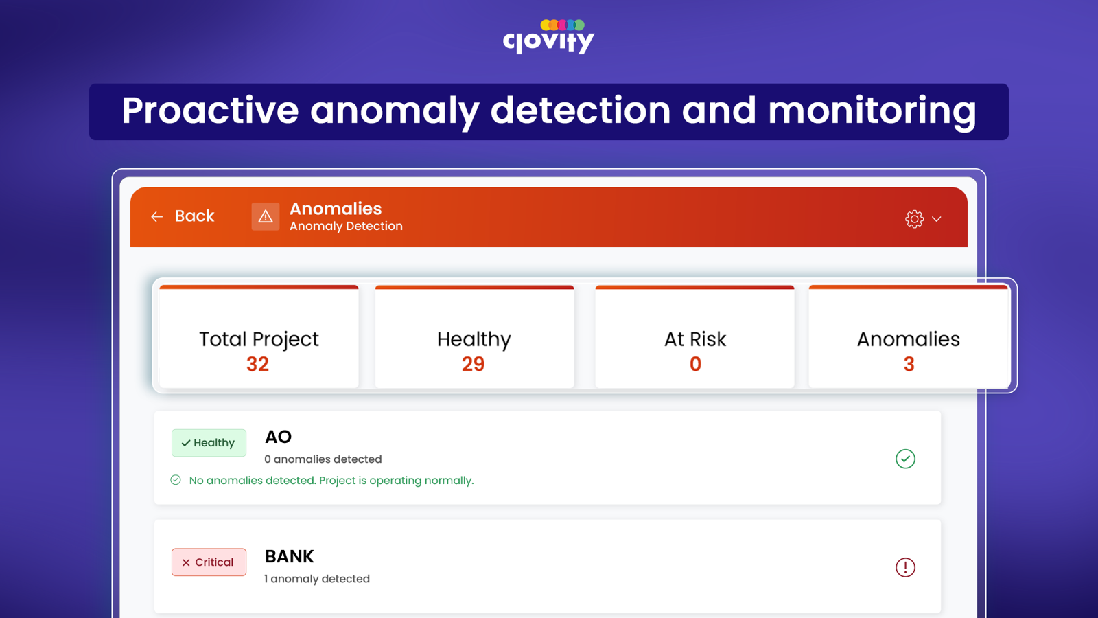 Automatically detect project anomalies before they escalate. Monitor org-wide health, flag critical issues across projects, and stay ahead of risks with real-time status tracking