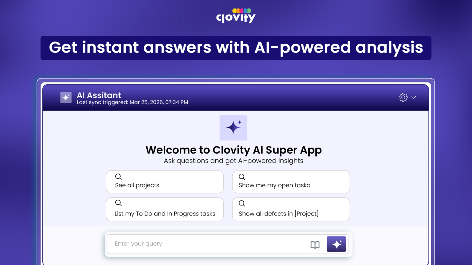 Chat with your Jira data instantly. Ask about open tasks, defects, sprint status, or project progress and get clear, AI-powered answers โ no manual searching or report-building required