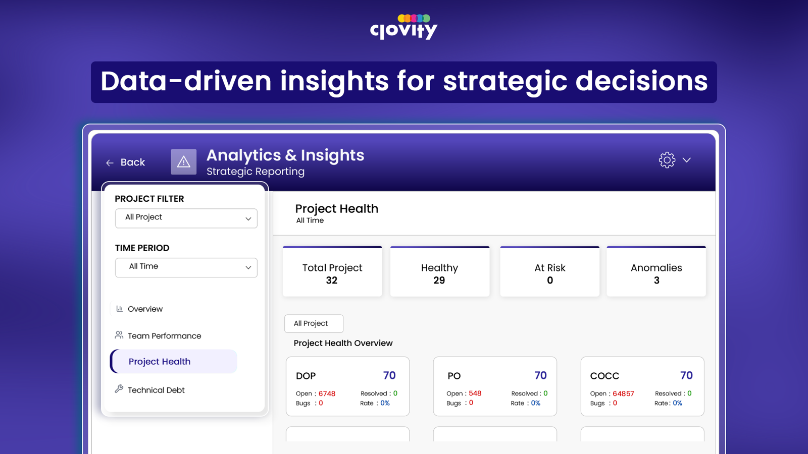 Get a real-time view of project health across your org โ track healthy vs at-risk projects, open issues, resolution rates, and technical debt, all in one unified analytics dashboard