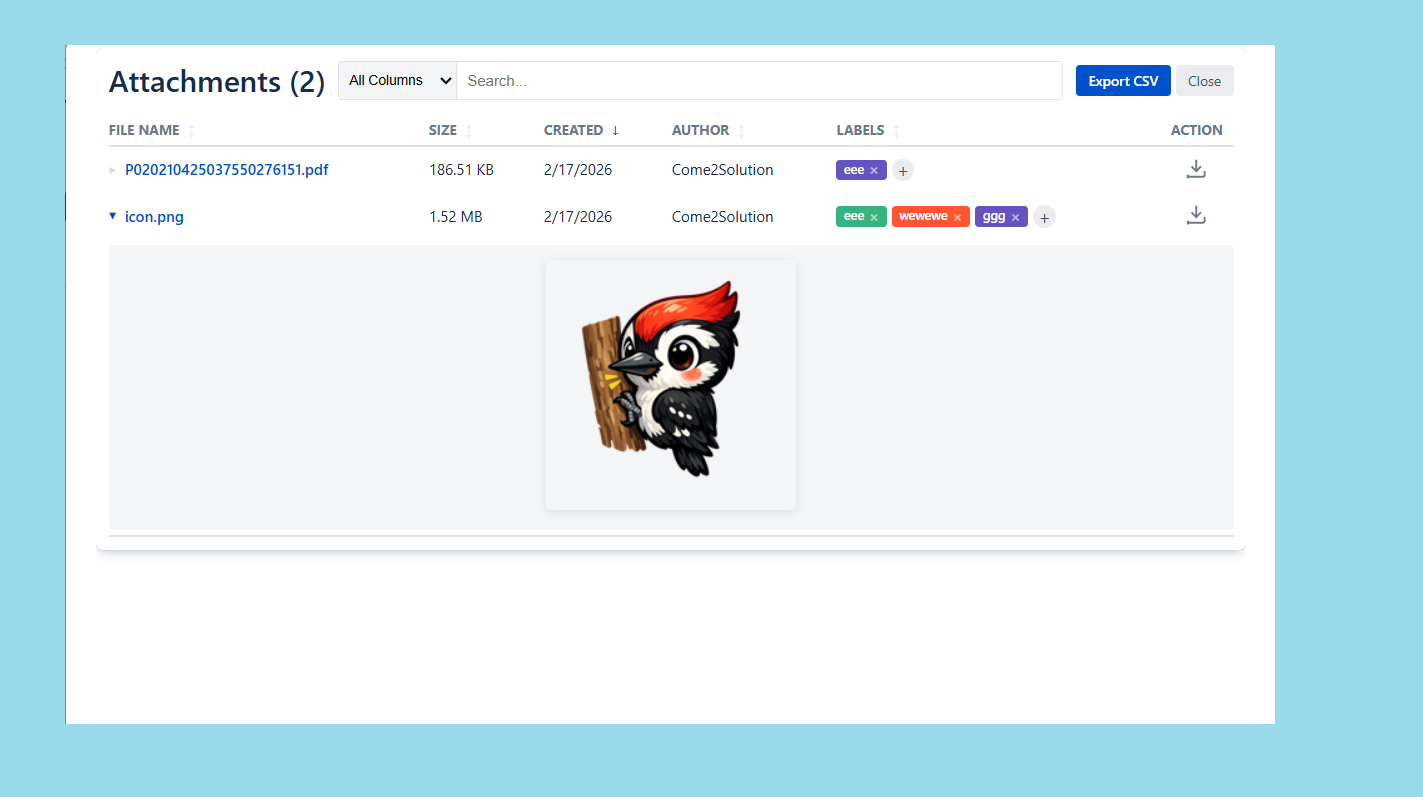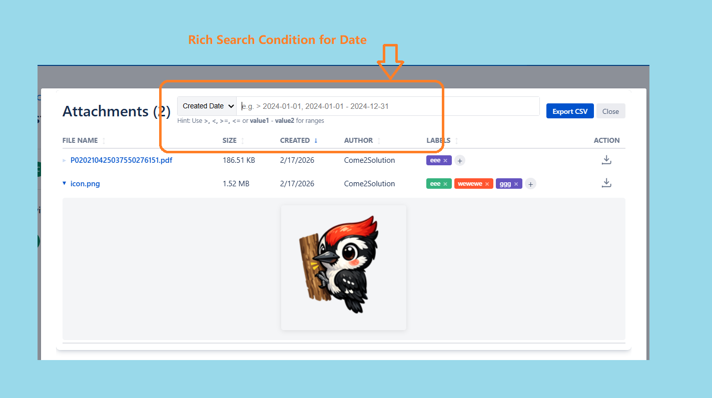 Key highlights of the appAttachment management to view, search, filter, label, preview, and download attachments and CSV export