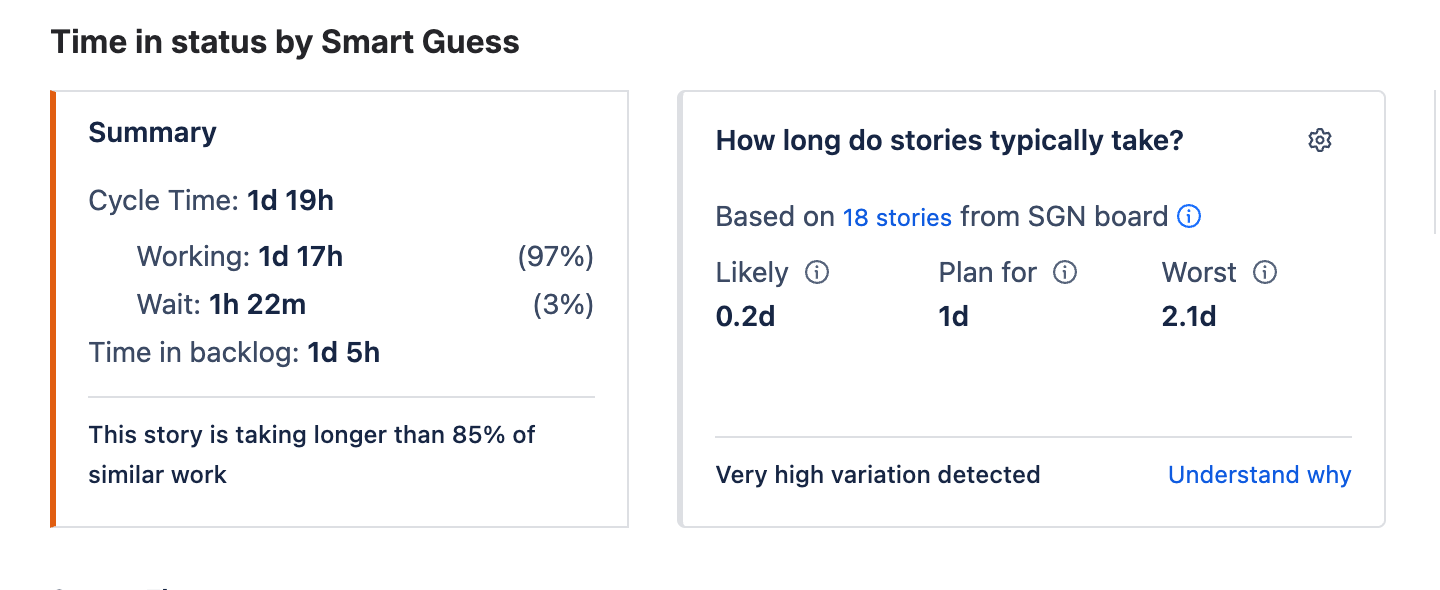 The Summary card compares the cycle time to similar completed work. Is this story taking longer than usual? You'll know instantly—color-coded health, working vs wait time, and how it stacks up against your team's history