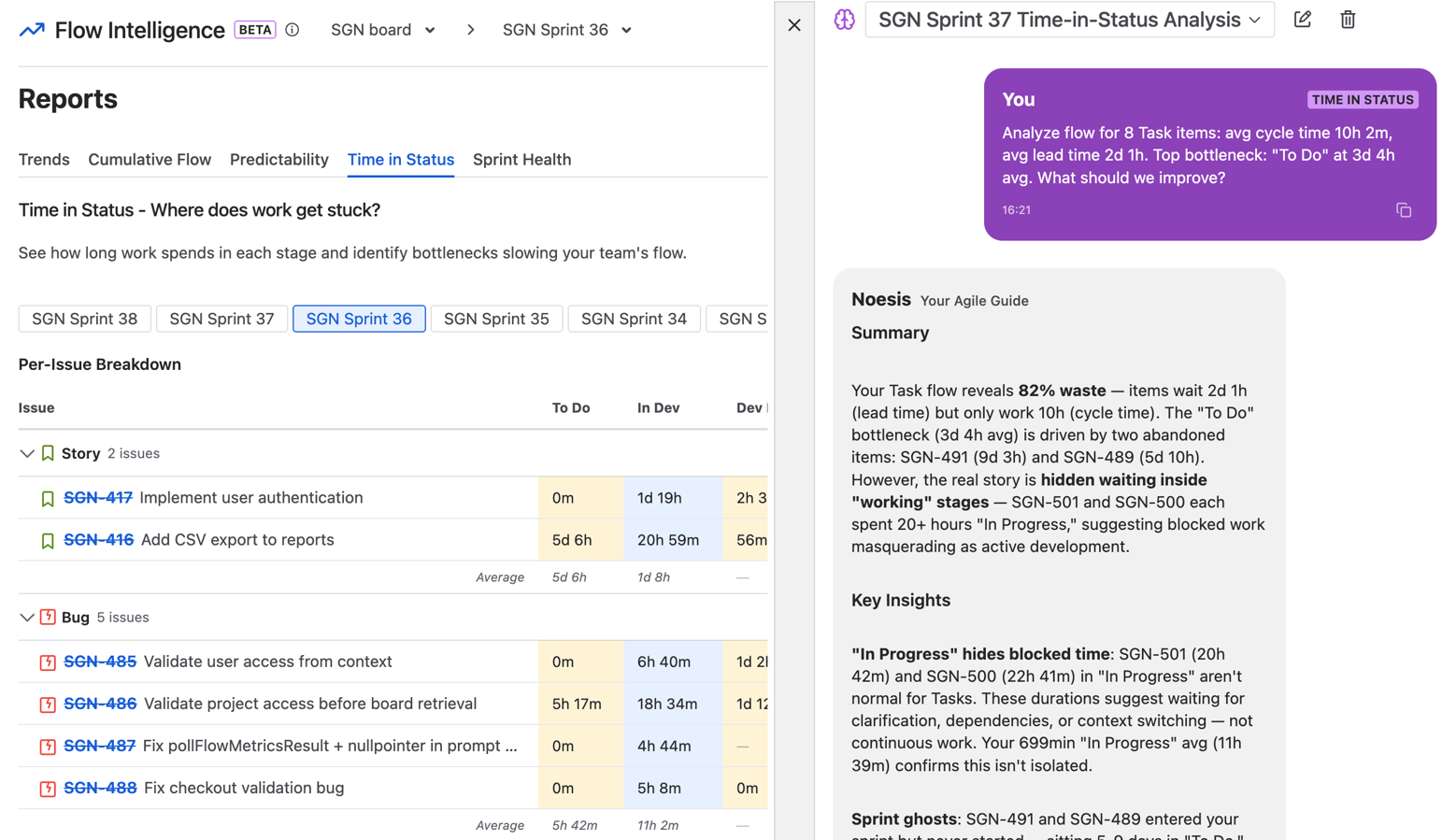 The Sprint Report shows time in status across all sprint issues — spot outliers, find bottlenecks. Let AI pinpoint which improvements have the highest leverage.