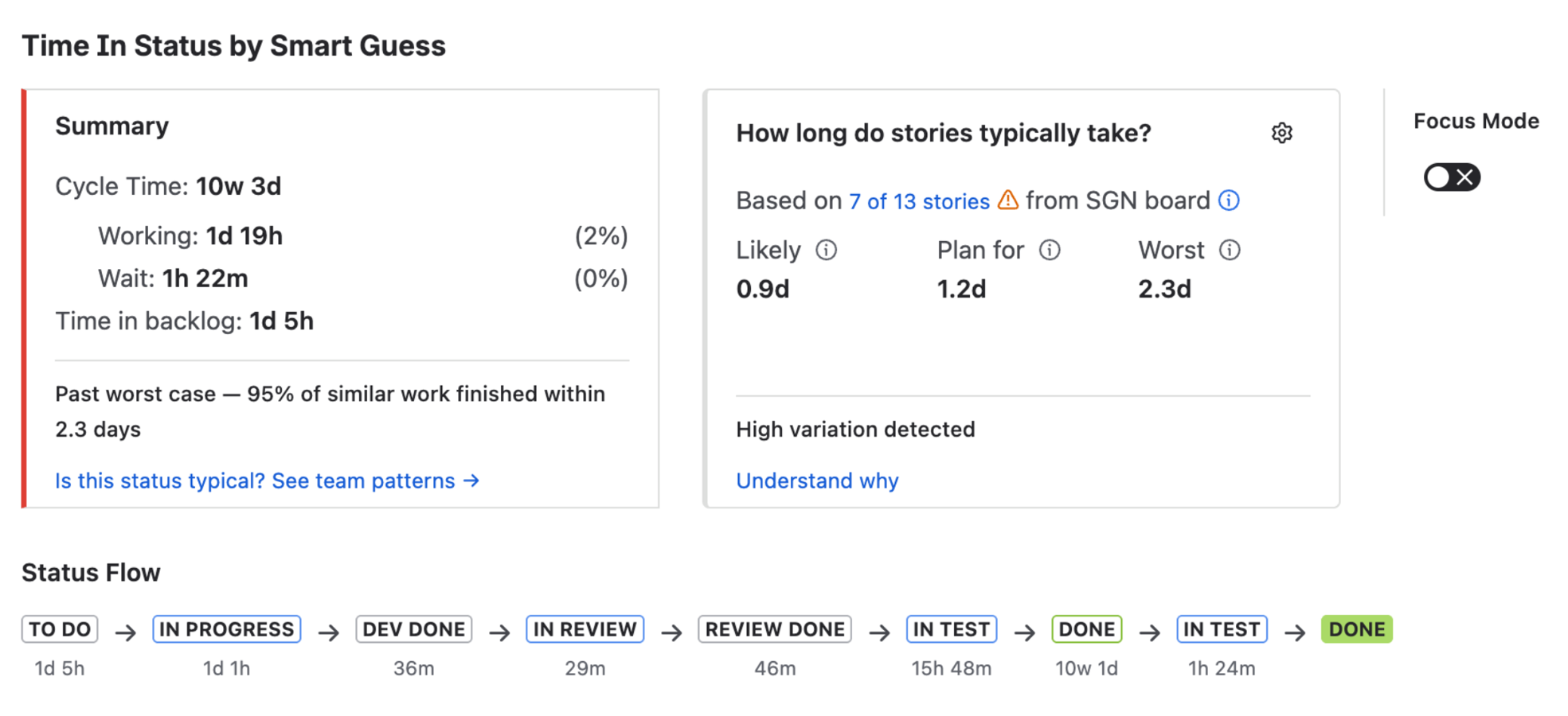 The Summary card compares the cycle time to similar work. Taking longer than usual? You'll know instantly — color-coded health, working vs wait time, and how it stacks up.
