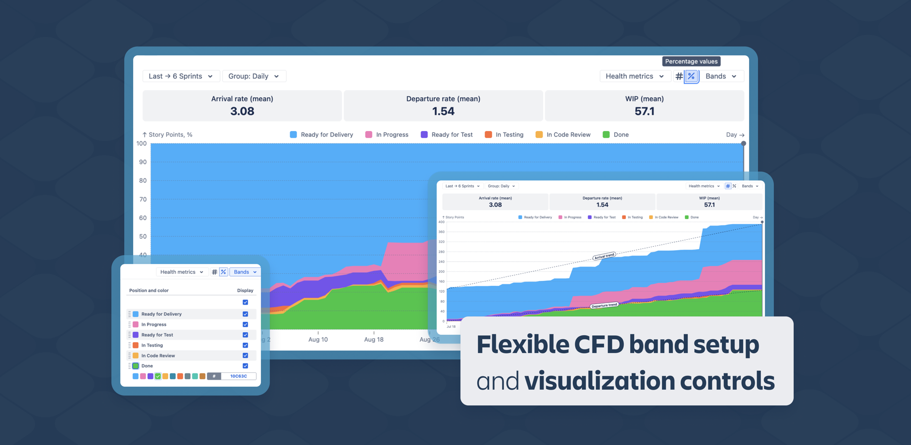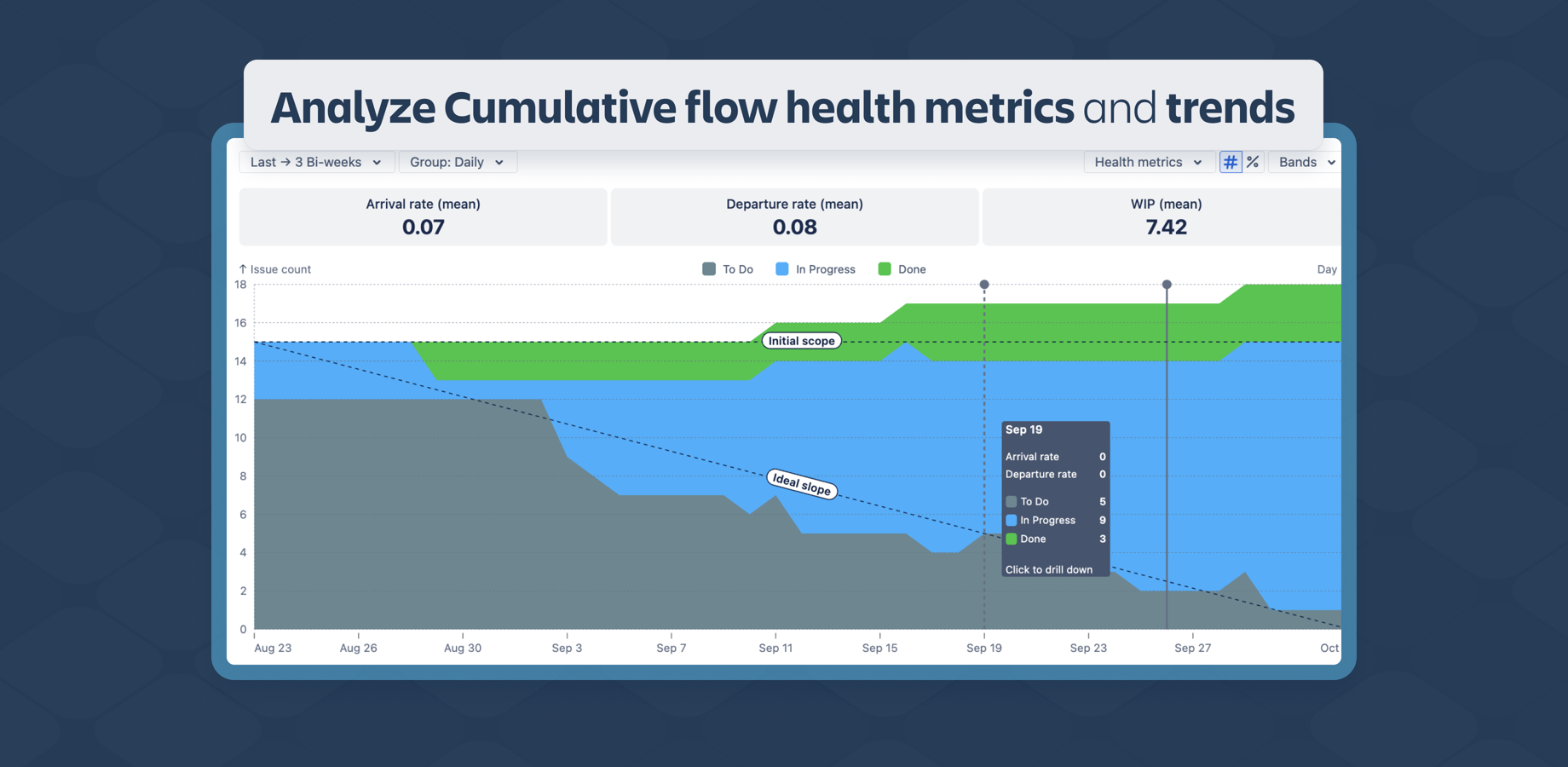 - Track Arrival/Departure rates, WIP (work in progress) in one place for flow health insights